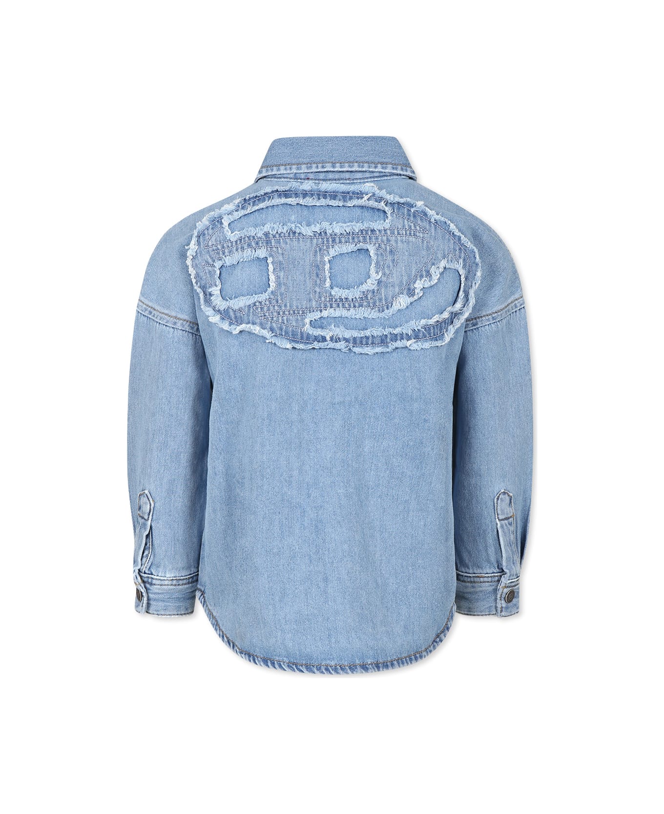 Blue denim shirt, long sleeves, with pointed collar and front closure with snap buttons. It is embellished with fringed logo on the back.