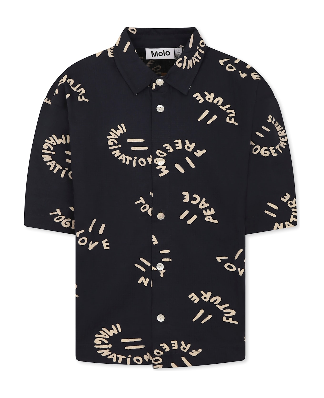 Blue GOTS certified organic cotton shirt, short sleeves, with pointed collar and front button closure. It is embellished with smiley and all-over writing.