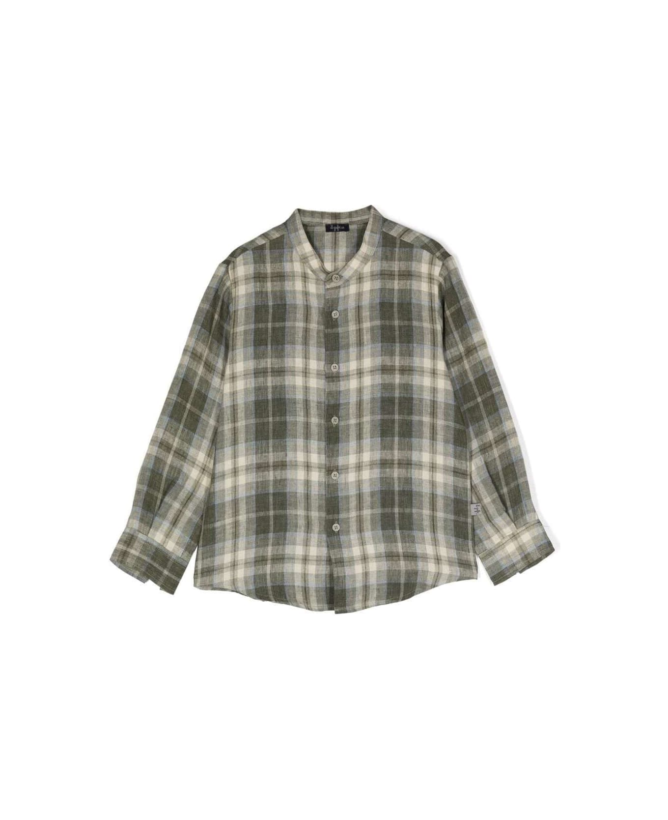 Khaki Green Shirt With Checkered Motif All-over In Linen Boy