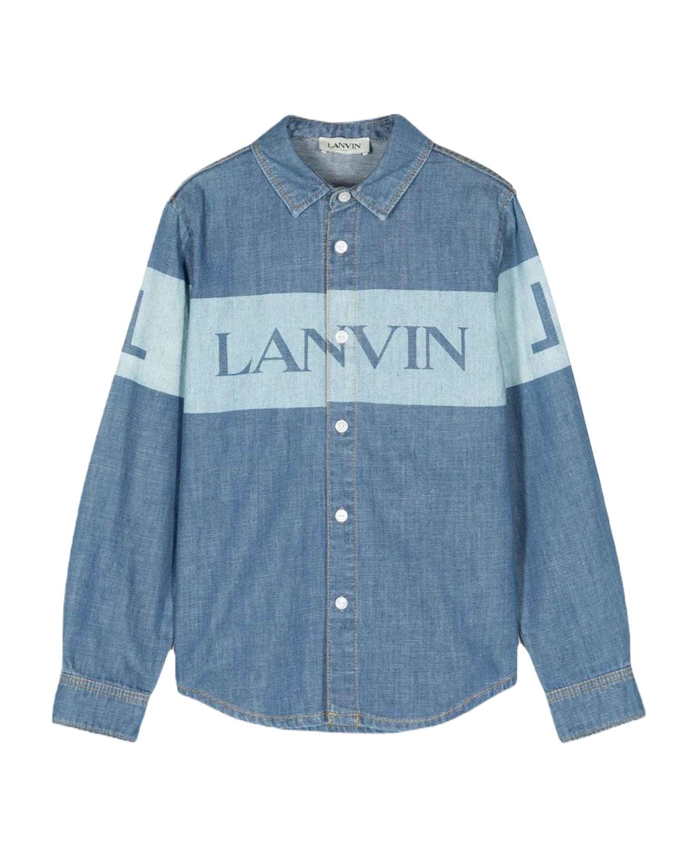 Denim blue shirt boy. Logo print on the chest, insert design, classic collar, front button closure, long sleeves and curved hem. 100% Cotton
