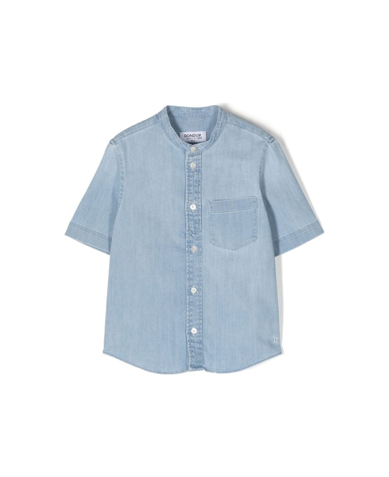 Dondup Junior short-sleeved shirt in light blue washed denim with korean collar, breast pocket and front button fastening.