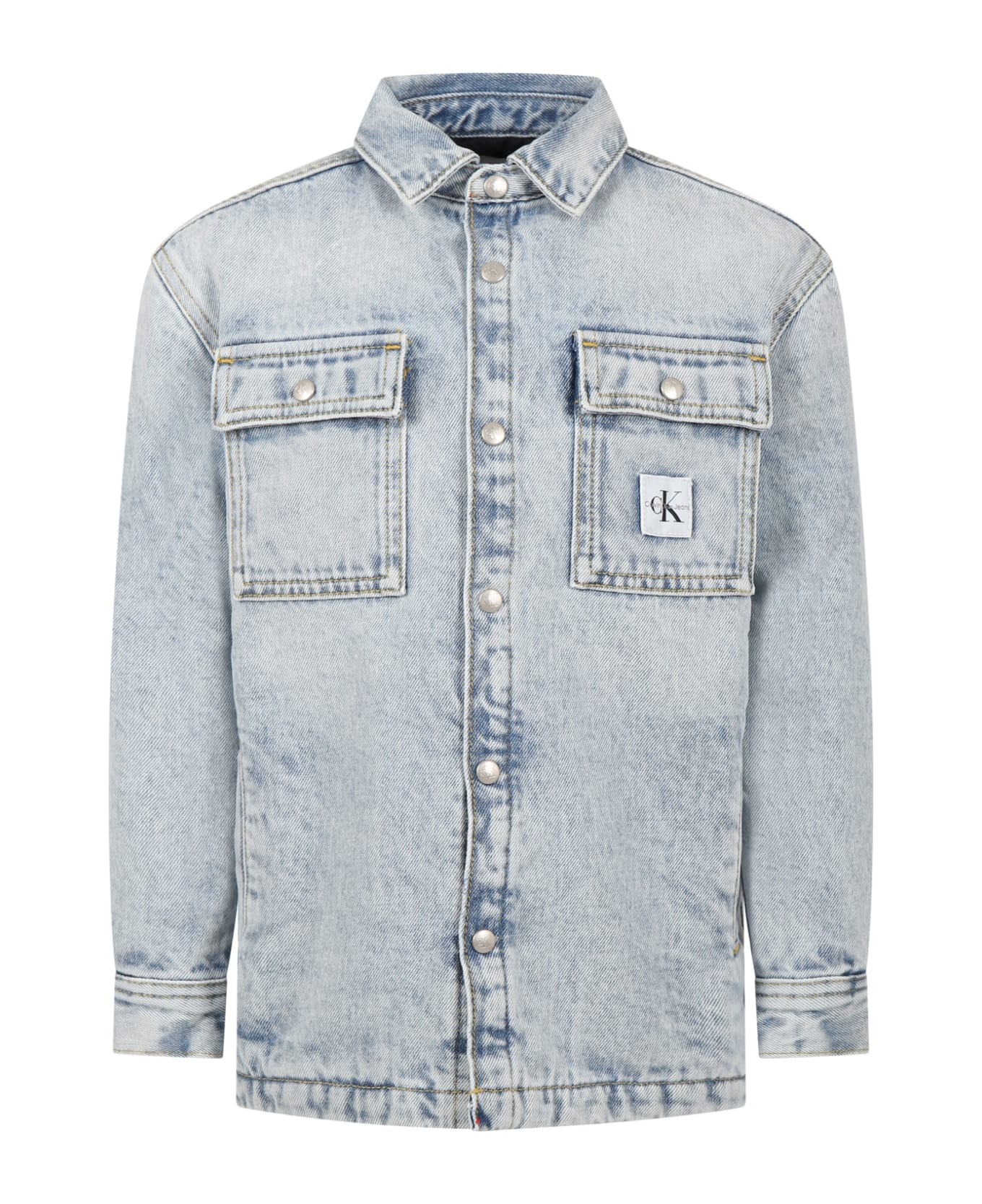 Light blue denim padded shirt, in cotton, with long sleeves, collar, closure with press studs on the front, side pockets, small pockets with press studs on the front. It is decorated with a logo patch on the front.