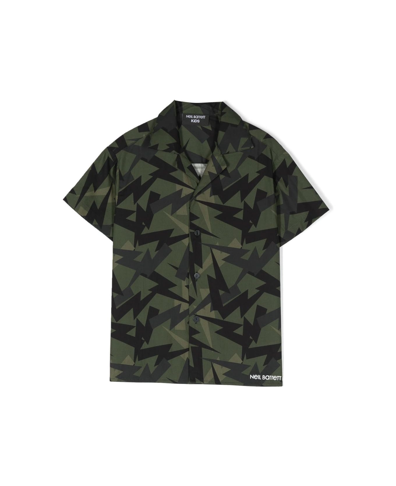 Short-sleeved shirt, green background and black prints, closure with buttons. 100% cotton