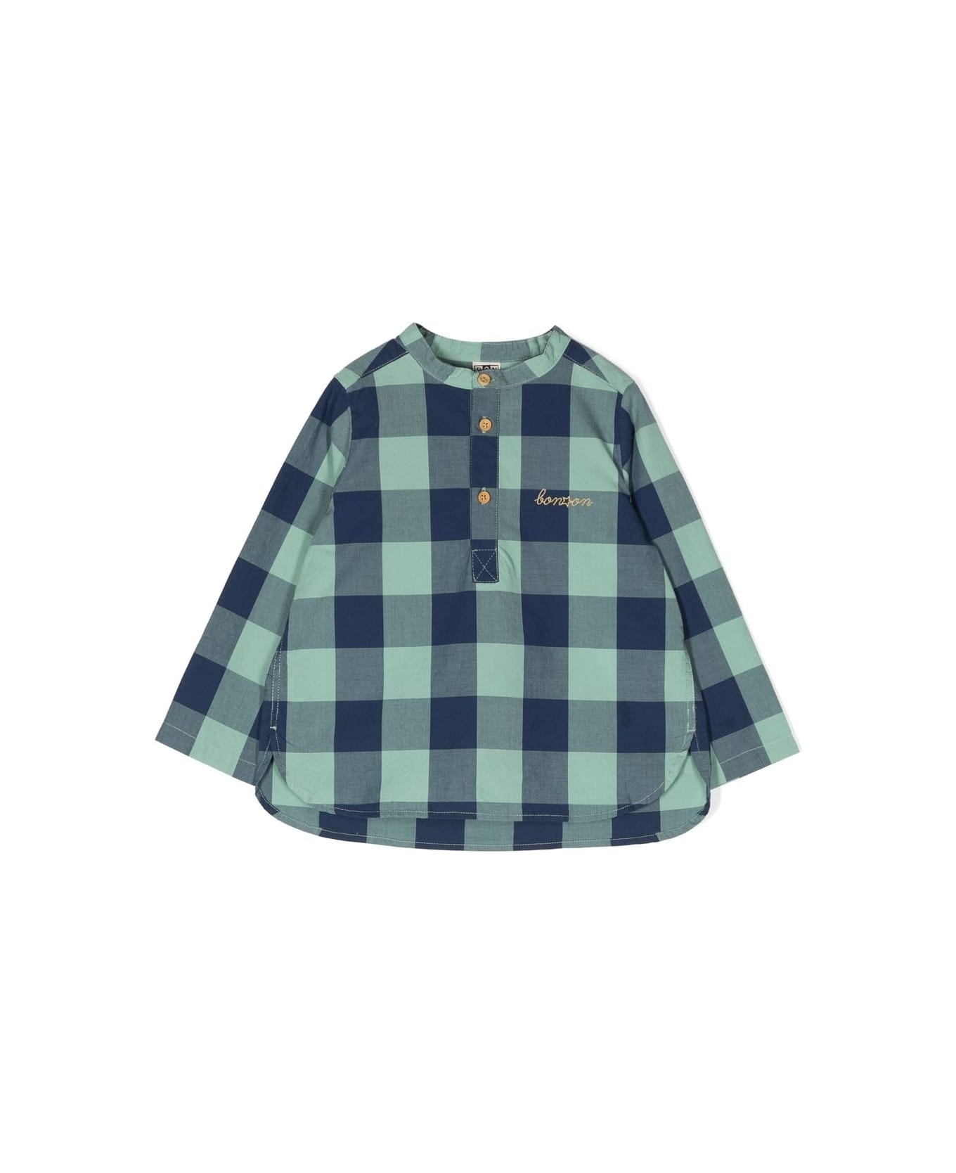 Navy blue, cotton, embroidered logo, check pattern, collarless design, round neckline, short front button placket and long sleeves. Composition