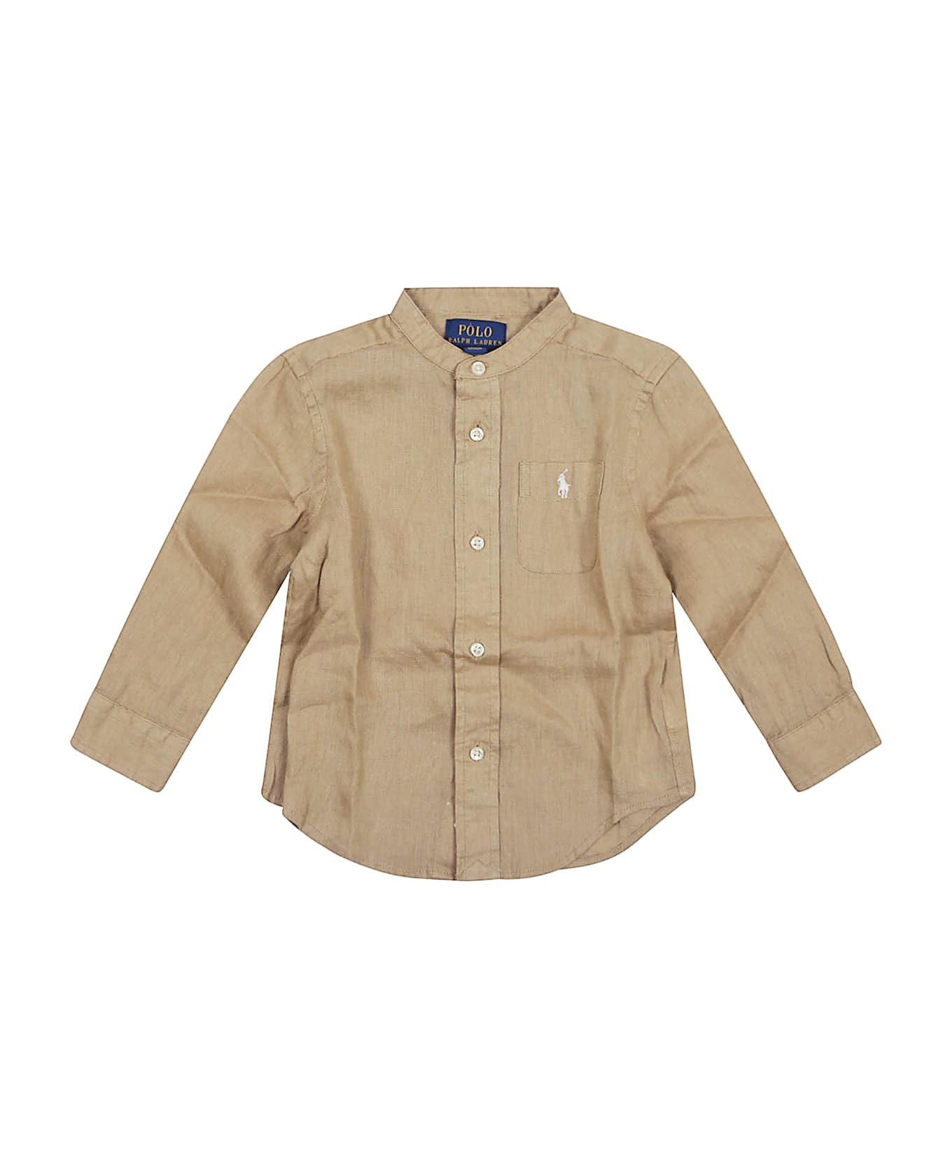 Linen shirt by RALPH LAUREN KIDS. Strap collar; long sleeves with buttoned cuffs; patch pocket on the left chest; button placket. Features embroidered pony on the left chest.