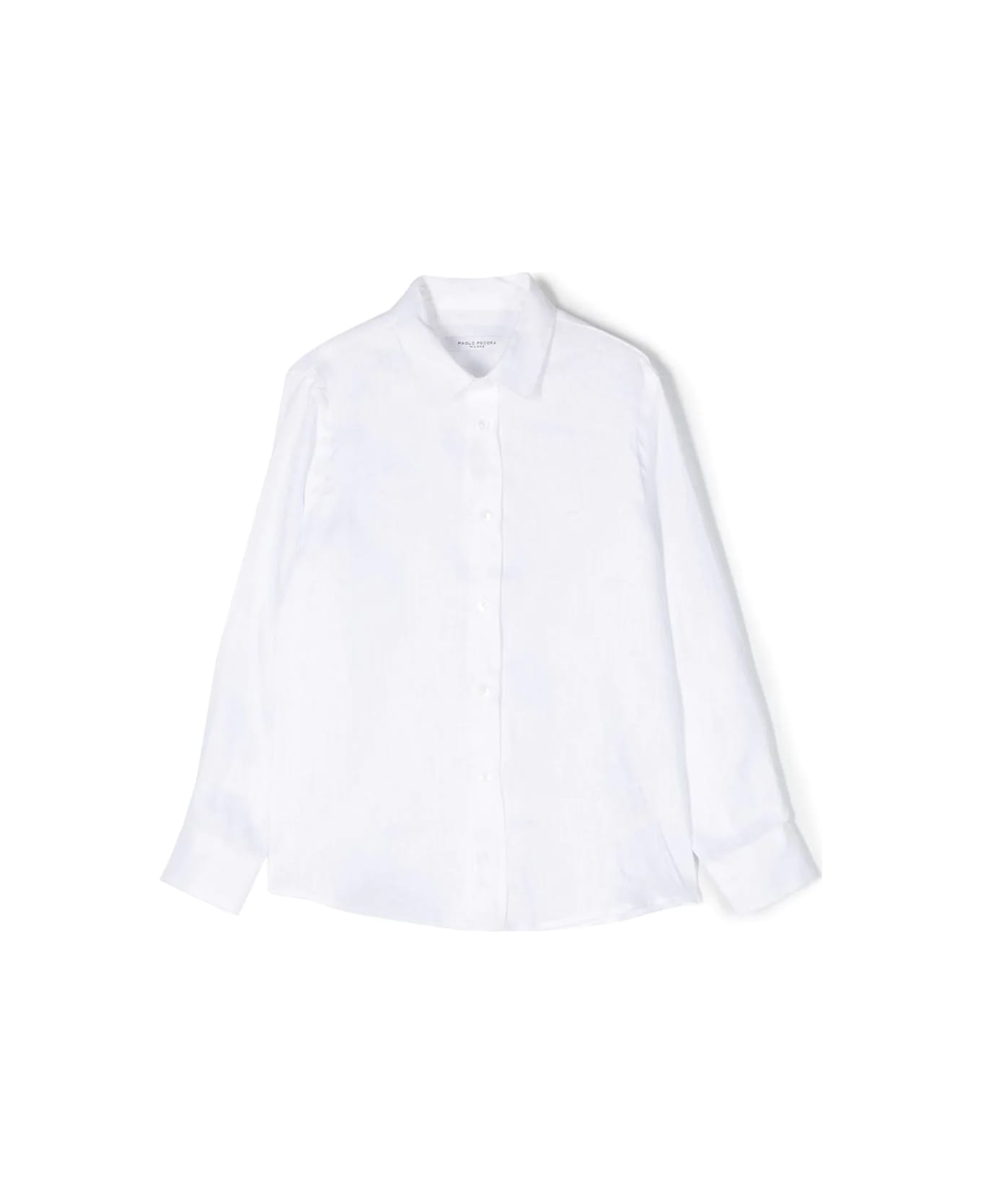 White, linen, classic collar, long sleeves, button cuffs, front button fastening and a straight hem. Origin: Italy