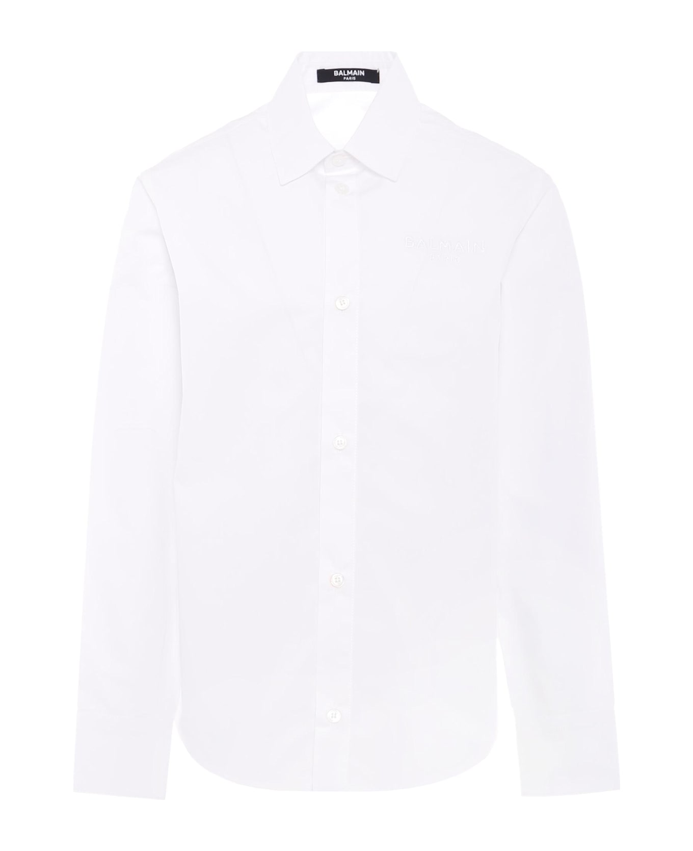White cotton poplin shirt, long sleeves, pointed collar, front button closure. It is embellished with Balmain logo embroidered on the chest.