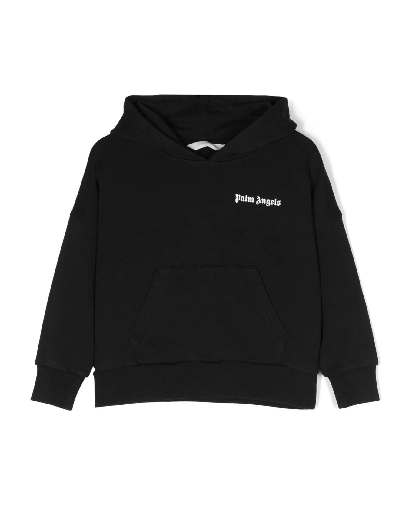 Palm Angels Kids hoodie made of black cotton and featuring a pouch pocket and Palm Angels logo printed in a contrasting colour on the left chest. Composition: Composition:, 100% Cotton.