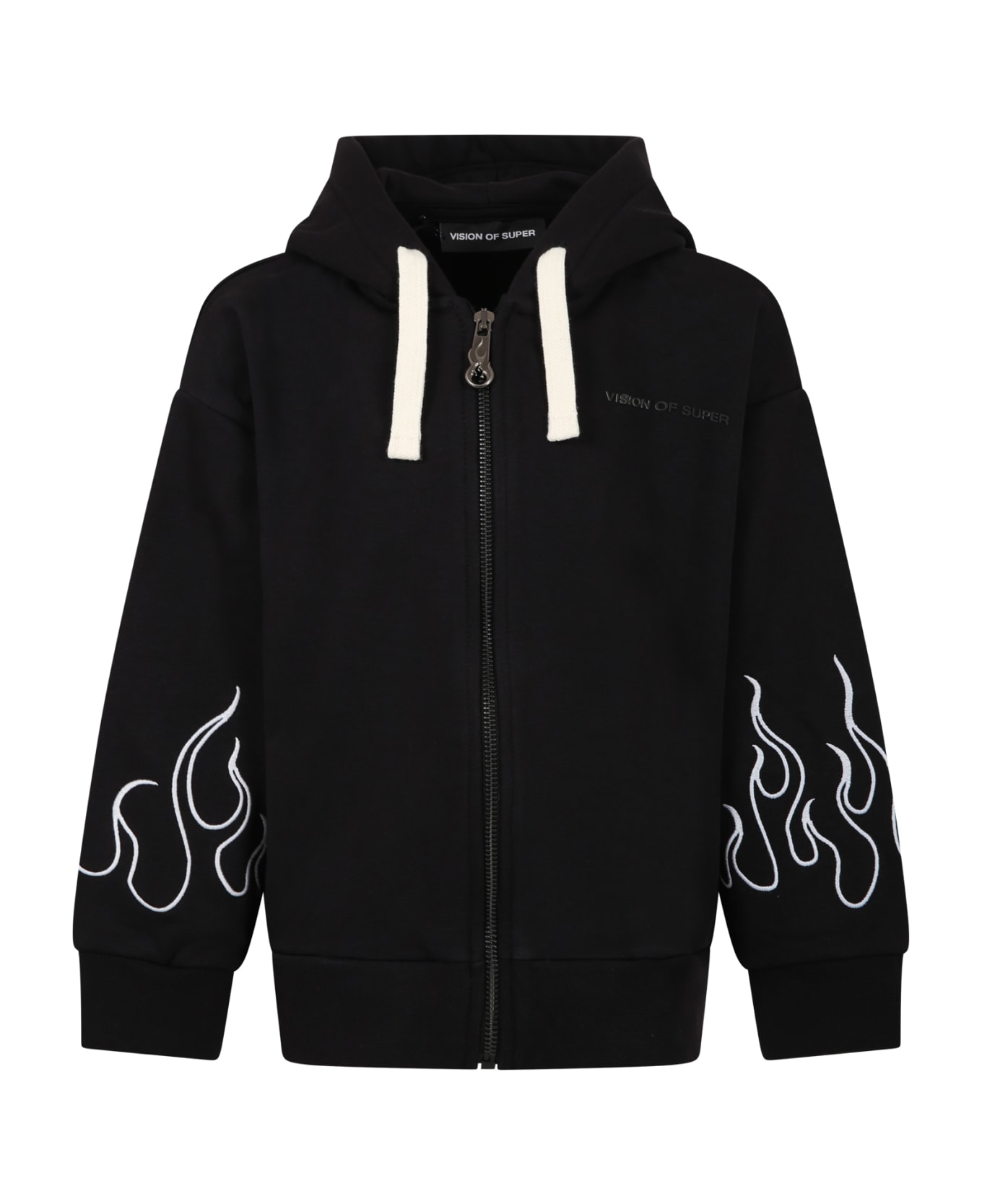 Black sweatshirt, in brushed cotton, with long sleeves, hood with drawstring, zip closure on the front, side pockets, ribbed cuffs and hem. It is embellished with embroidered flames on the sleeves and logo on the chest.