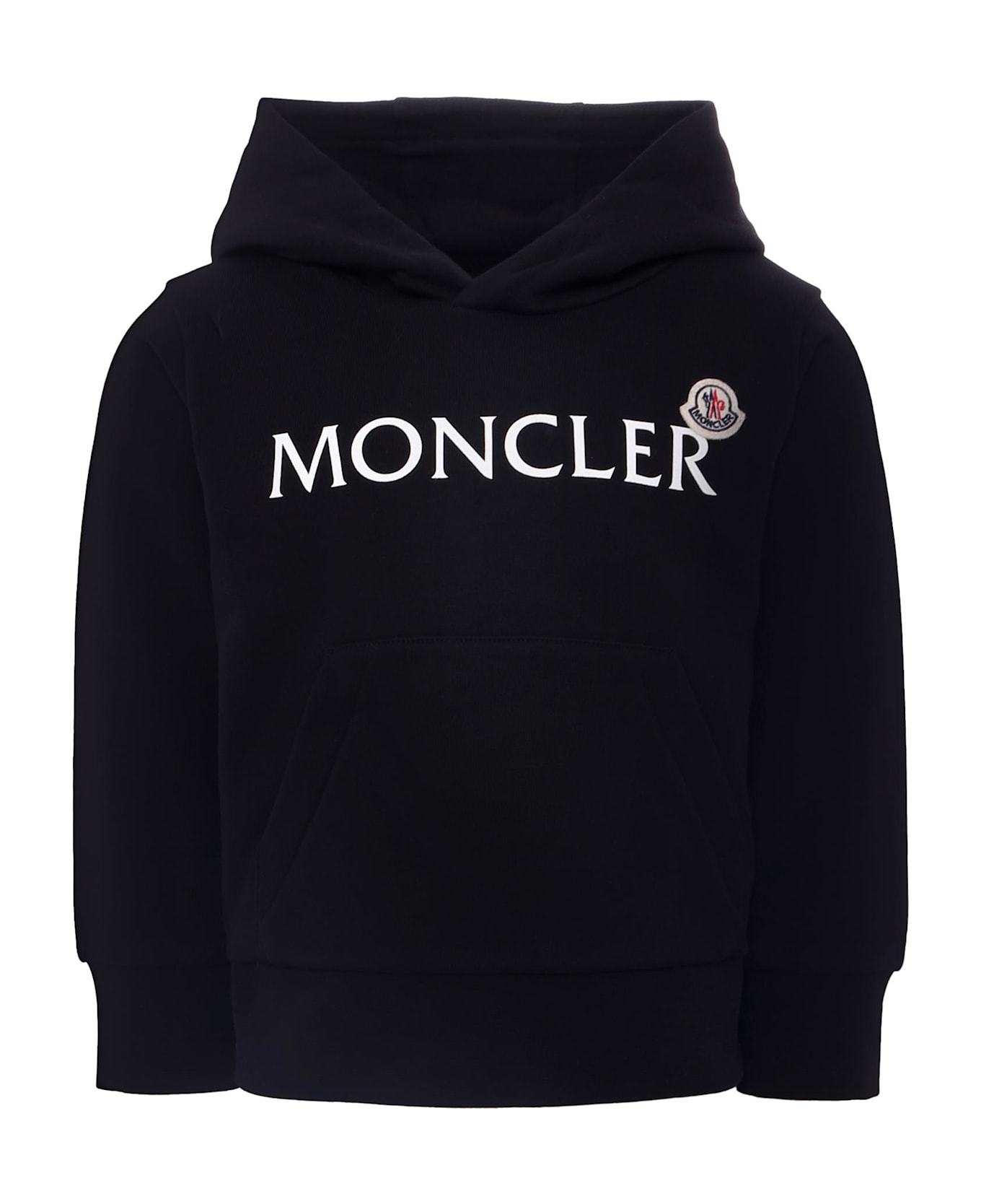 Black sweatshirt from the luxury brand Moncler Kids, in fleece cotton, with long sleeves, hood, front pocket, ribbed cuffs and hem. It is embellished with a logo print and an iconic logo patch on the front.