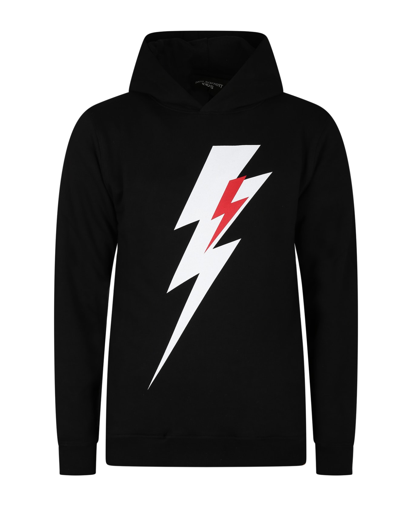 Black sweatshirt in brushed cotton, hood, long sleeves, ribbed crew neck, hem and cuffs, side pockets. It is embellished with the print of the white iconic thunderbolt of the logo.