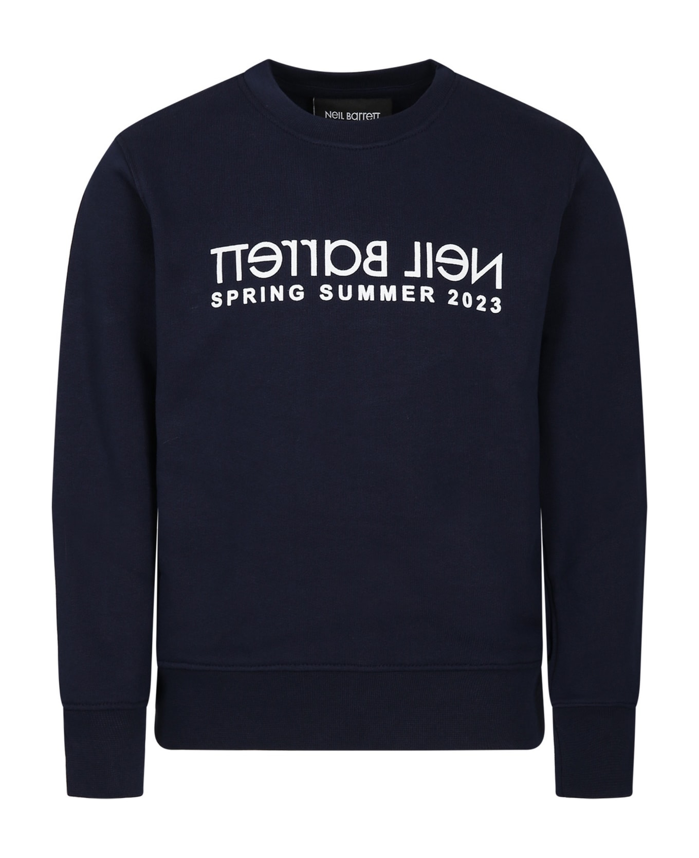 Bleu sweatshirt in brushed cotton, long sleeves, ribbed crew neck, hem and cuffs. It is embellished with the white print of the logo.