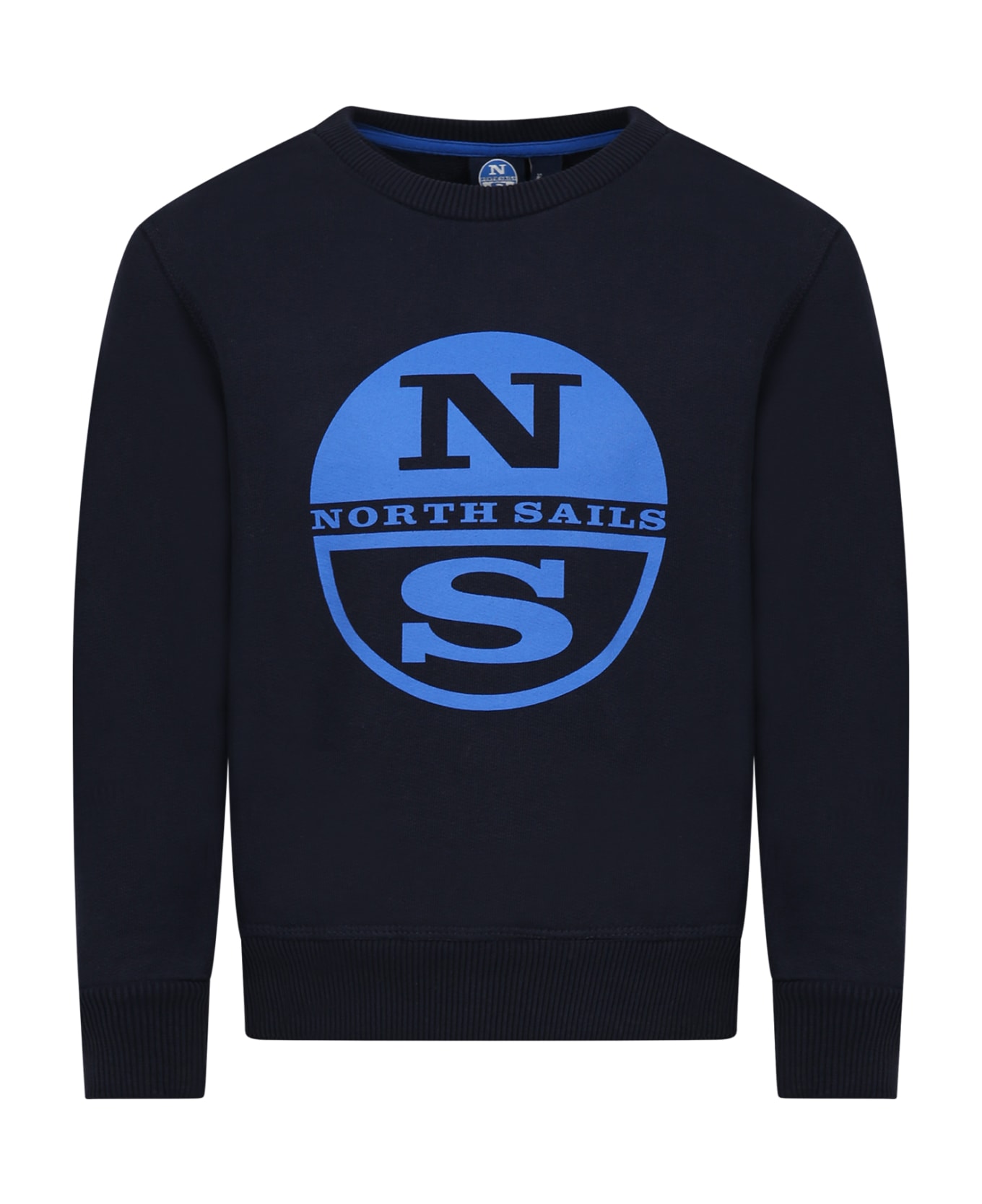 Blue poloshirt in organic cotton, long sleeves, crew-neck, ribbed crew-neck, hem and cuffs. It is embellished with light-blue logo print on the front.