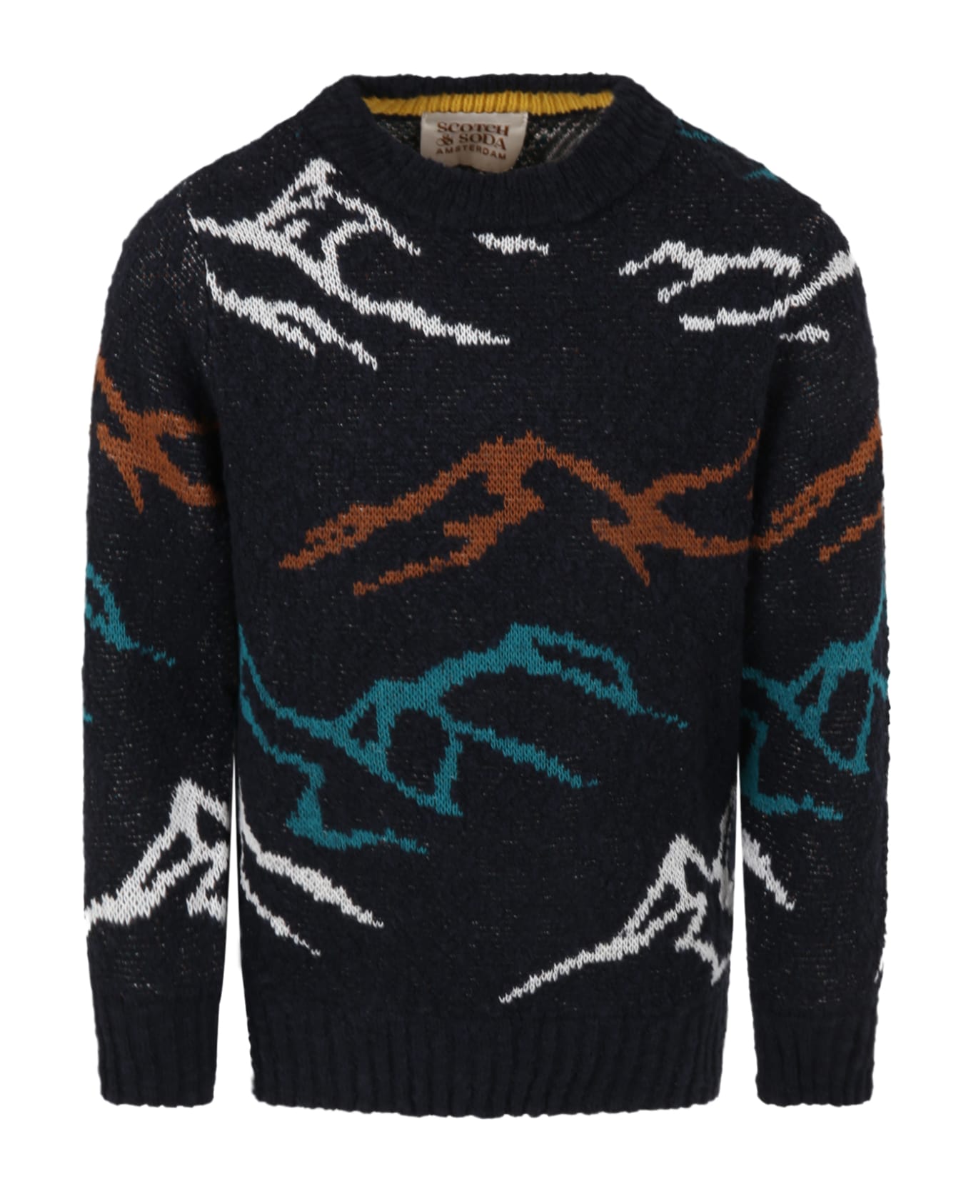 Blue sweater, with long sleeves and ribbed crew neck, hem and cuffs. It is embellished with colorful mountains and loged label, applied on the hem.