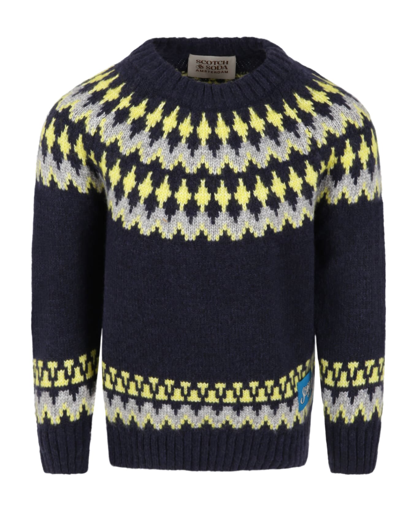 Blue sweater, with long sleeves and ribbed crew neck, hem and cuffs. It is embellished with colorful jacquard pattern.