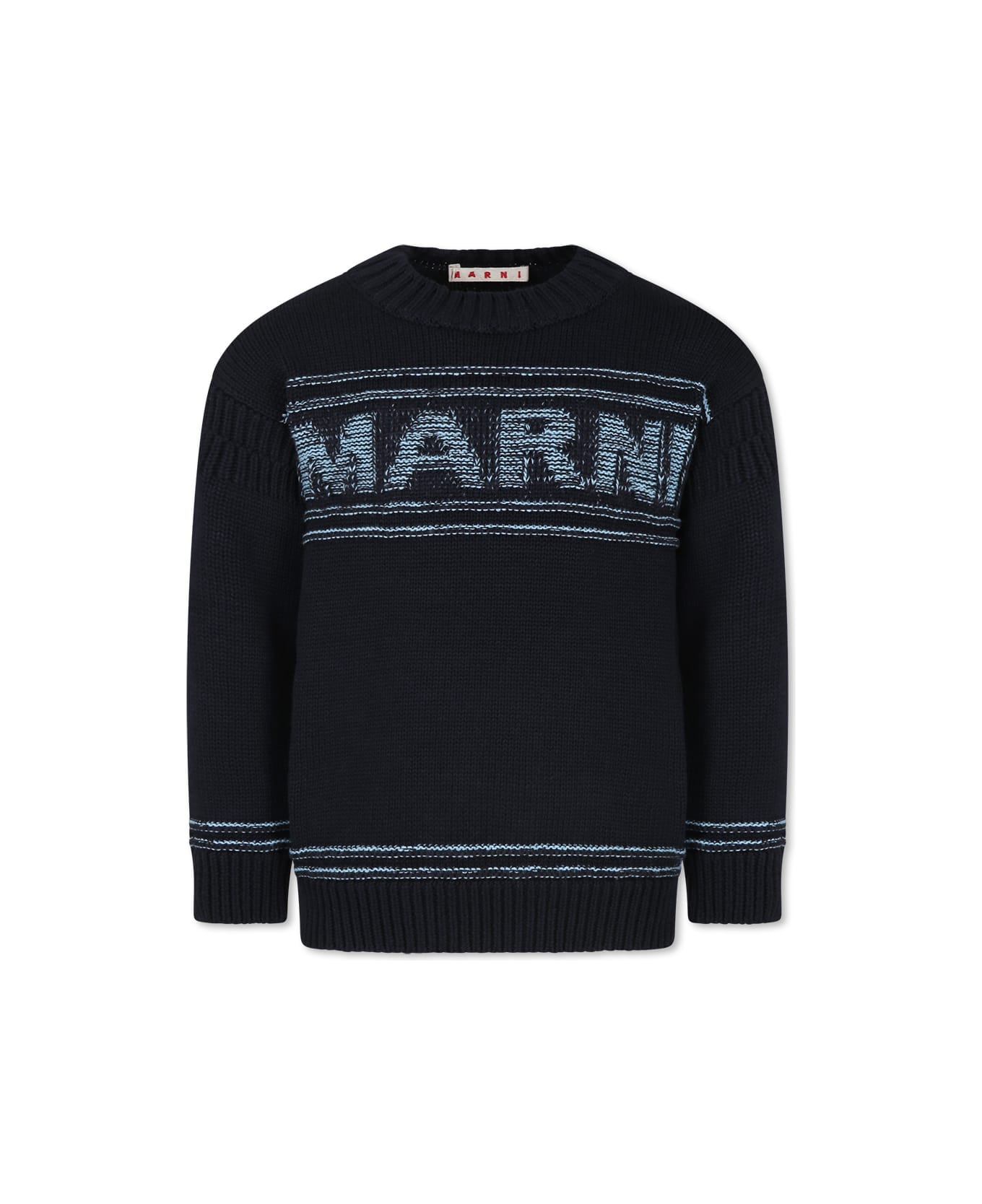 Blue cotton blend sweater, long sleeves, crew neck, ribbed cuffs and hem. It is embellished with jacquard Marni logo on the front.