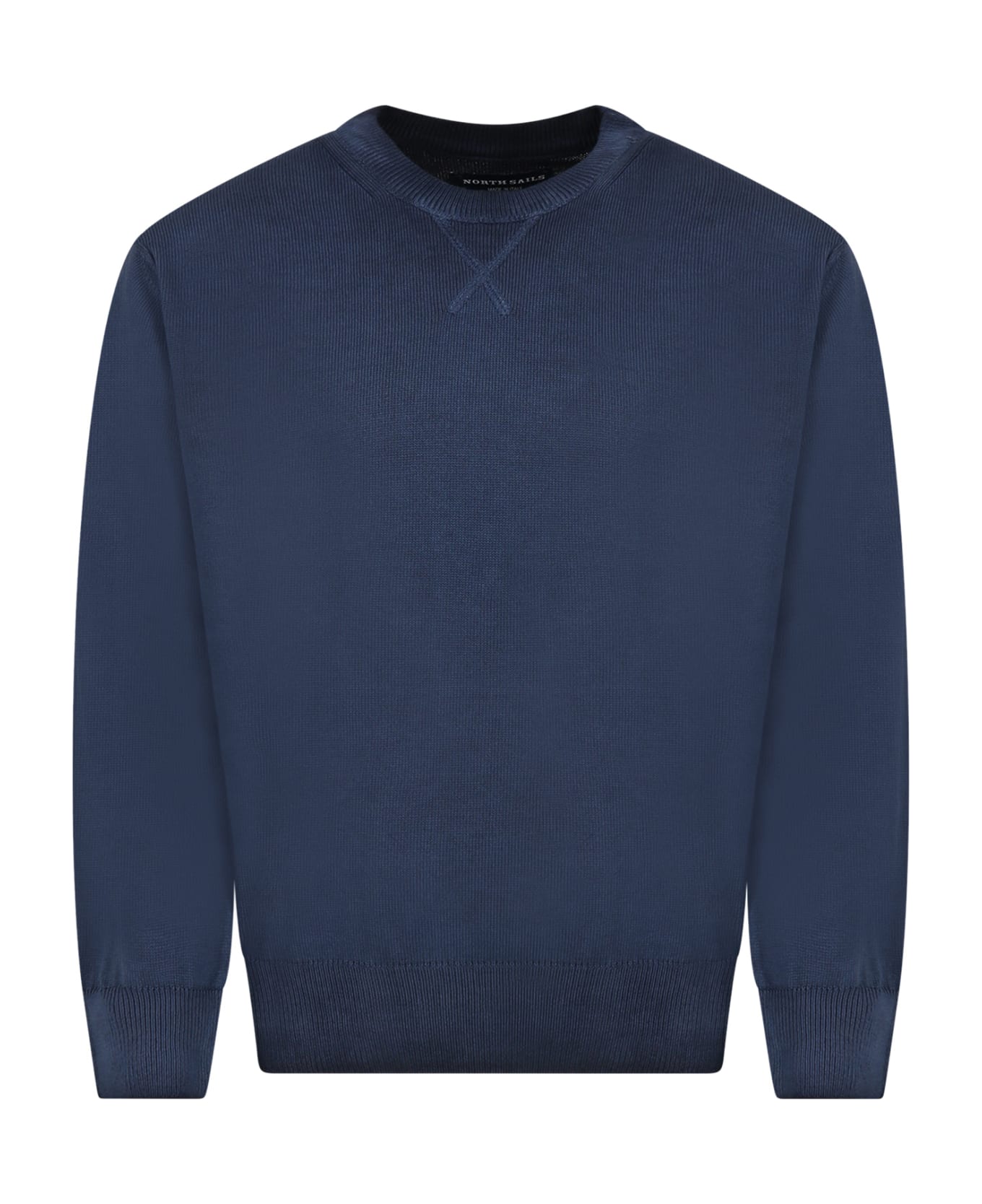 Blue sweater, in cotton, with long sleeves, ribbed crew neck, cuffs and hem. It is embellished with logo patch on the sleeve.