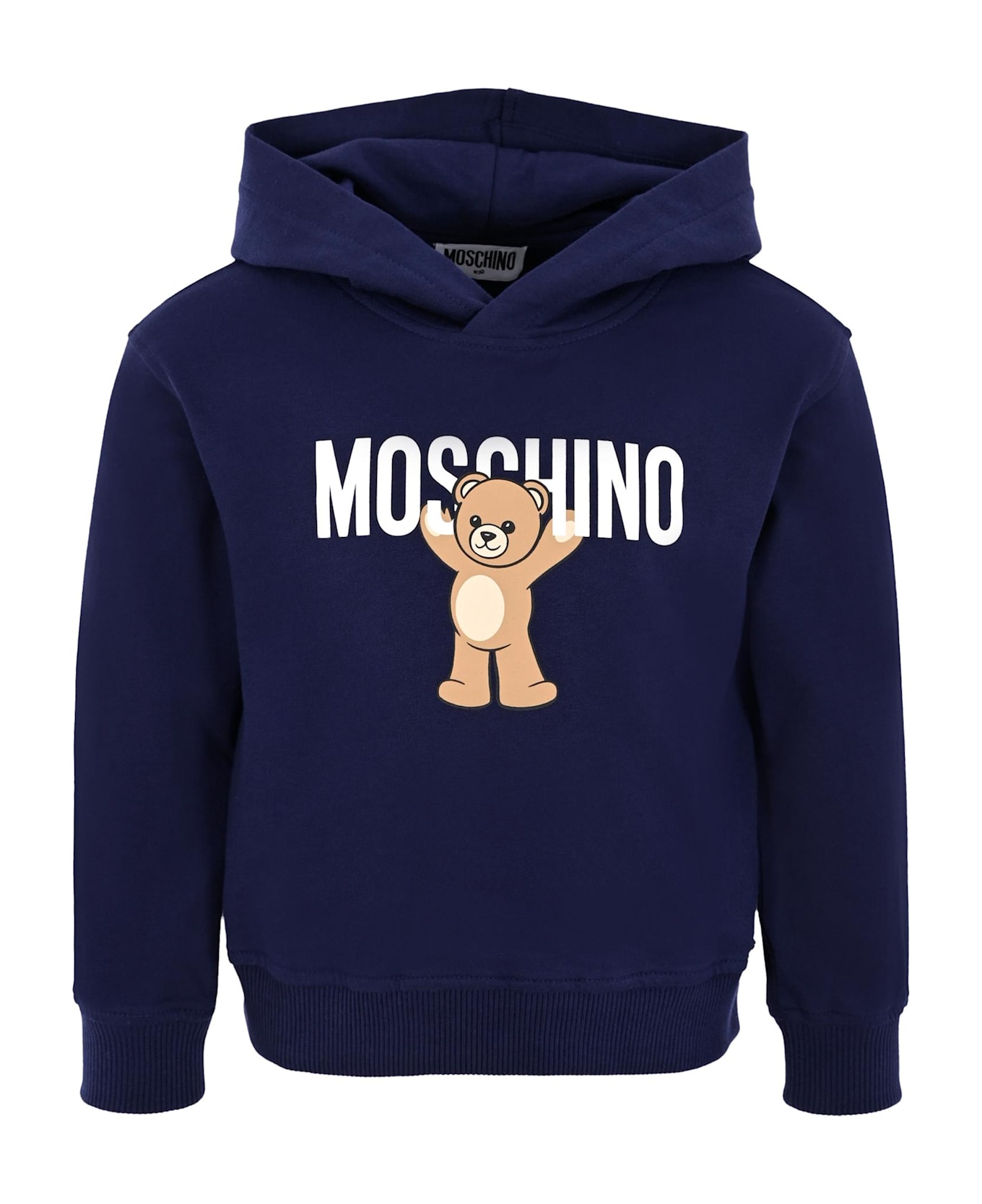 Blue sweatshirt in fleece cotton, long sleeves, with hood, cuffs and hem in ribbed. It is embellished with Teddy Berar print and logo, on the front.