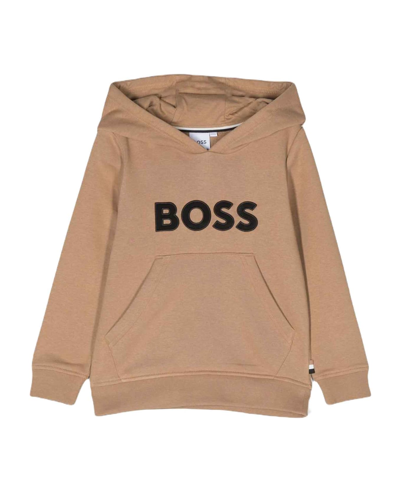 Brown sweatshirt boy. embroidered logo on the chest, hood, front pouch pocket, long sleeves and ribbed hem. Cotton 87%, Polyester 13%