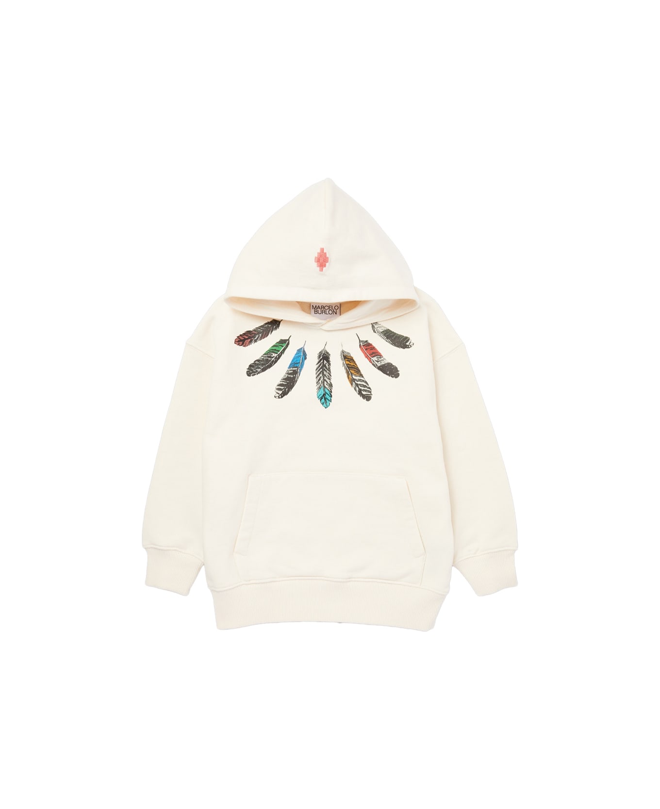 Marcelo Burlon Kids hoodie made from ecru cotton and featuring a regular fit, long sleeves, kangaroo pocket, ribbed hem and cuffs, coloured feathers printed on the front and a small orange cross logo on the hood.