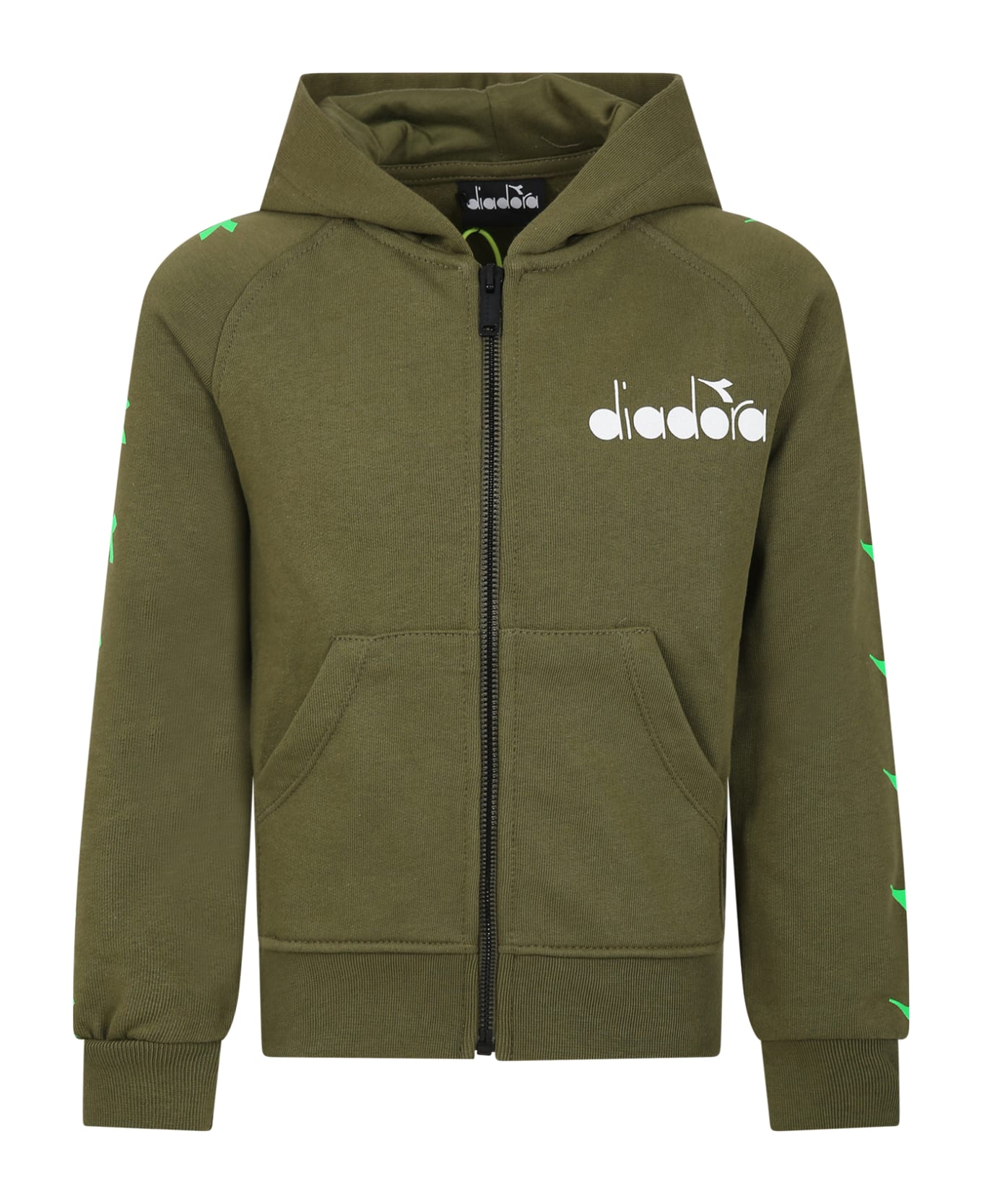 Green sweatshirt in fleece cotton, with long sleeves, ribbed cuffs and hem, hood, front zip closure and side pockets. It is embellished with logo on the sleeves, chest and back.