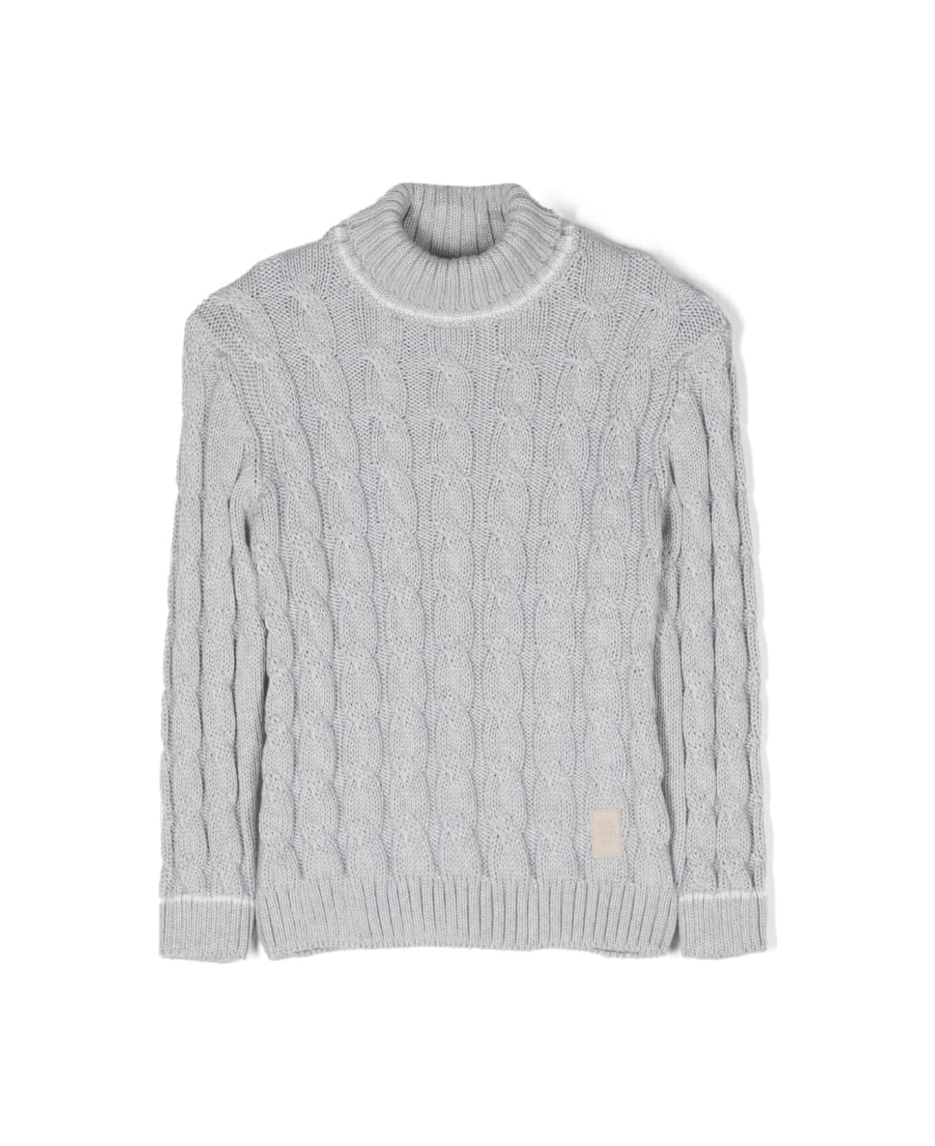 Eleventy Kids turtleneck sweater made of grey virgin wool with cable knit, ribbed finishes, thin contrasting stripes and logo application on the front bottom. Composition: 100% Virgin Wool