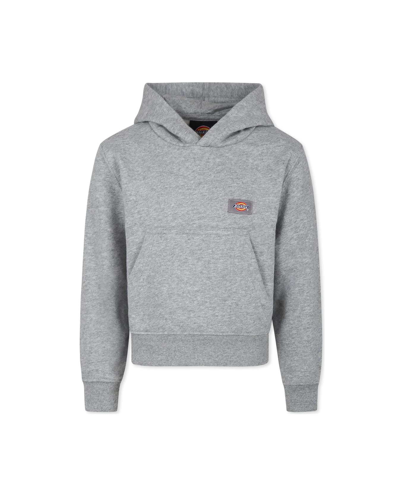Grey sweatshirt in fleece cotton, long sleeves, with hood, front pocket, ribbed cuffs and hem. It is embellished with an embroidered logo patch on the chest.