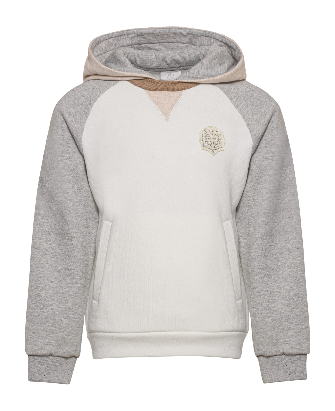 Ice grey, light beige, cotton, color-block design, embroidered logo, hood, long sleeves, two side welt pockets and straight hem. Composition