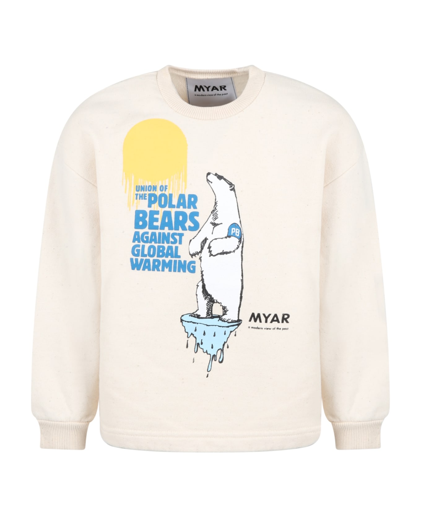 Ivory sweatshirt, with long sleeves and ribbed crew neck. It is embellished with white bear, black wrritings and logo, on the front.