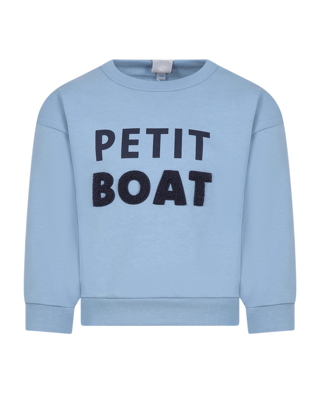 Light blue sweatshirt made of brushed organic cotton, with long sleeves, with ribbed crew-neck, cuffs and hem. It is embellished with "Petiti Boat" writing on the front and logo on the side.