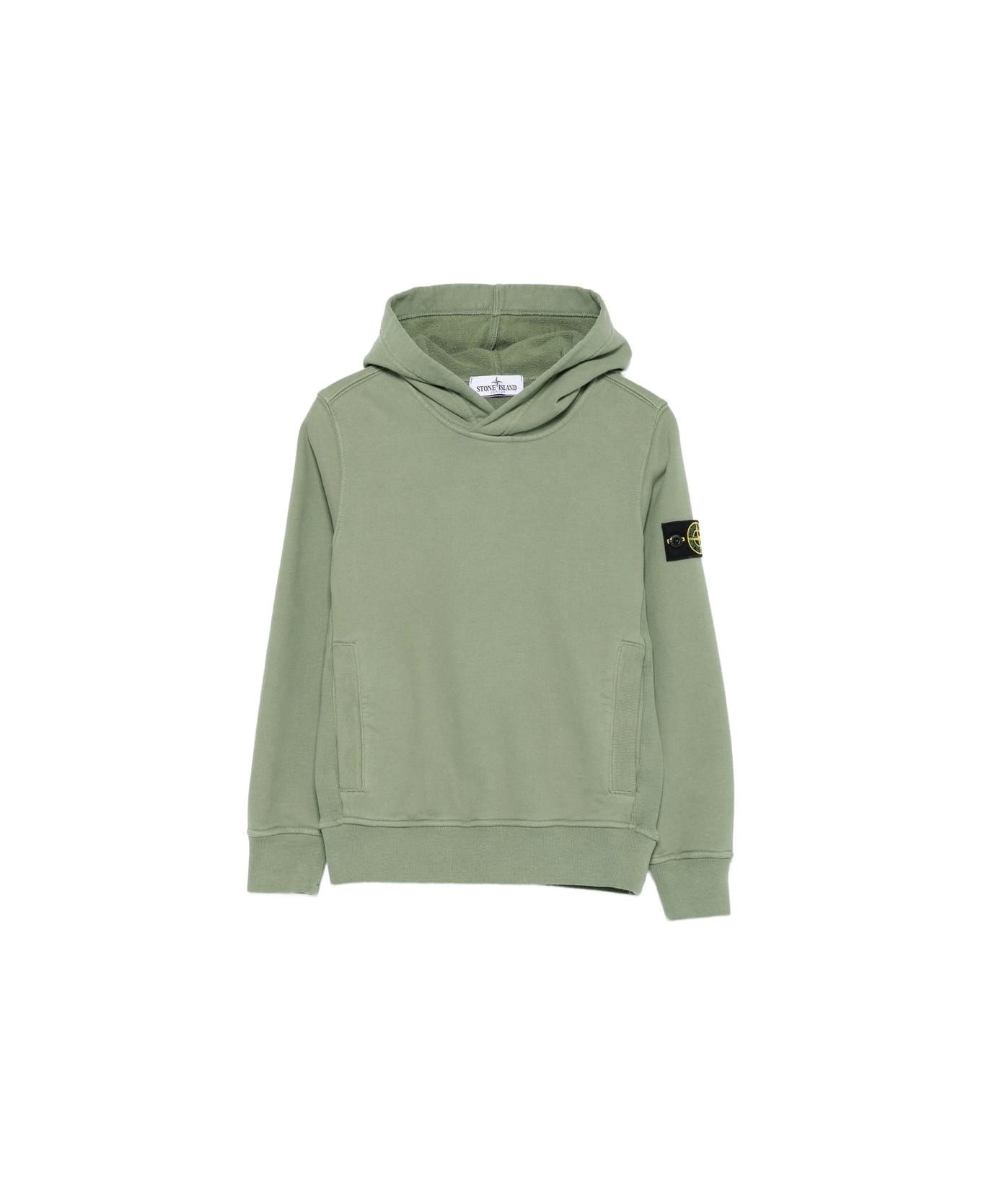 sage green kangaroo pocket hooded neckline long sleeves ribbed cuffs brand patch