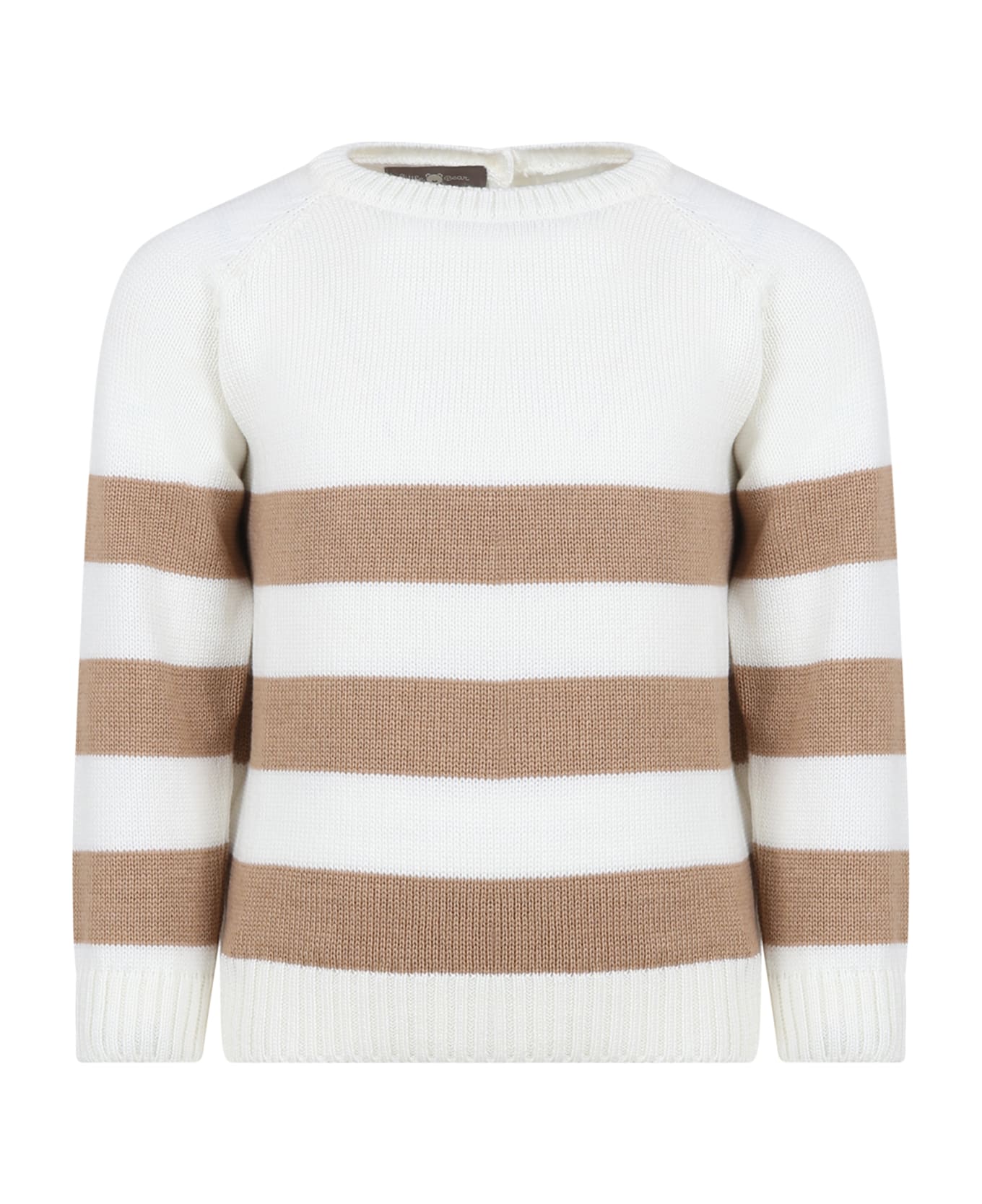 White wool sweater, long sleeves, with ribbed crew neck, cuffs and hem, button closure on the back. It is embellished with brown stripes.