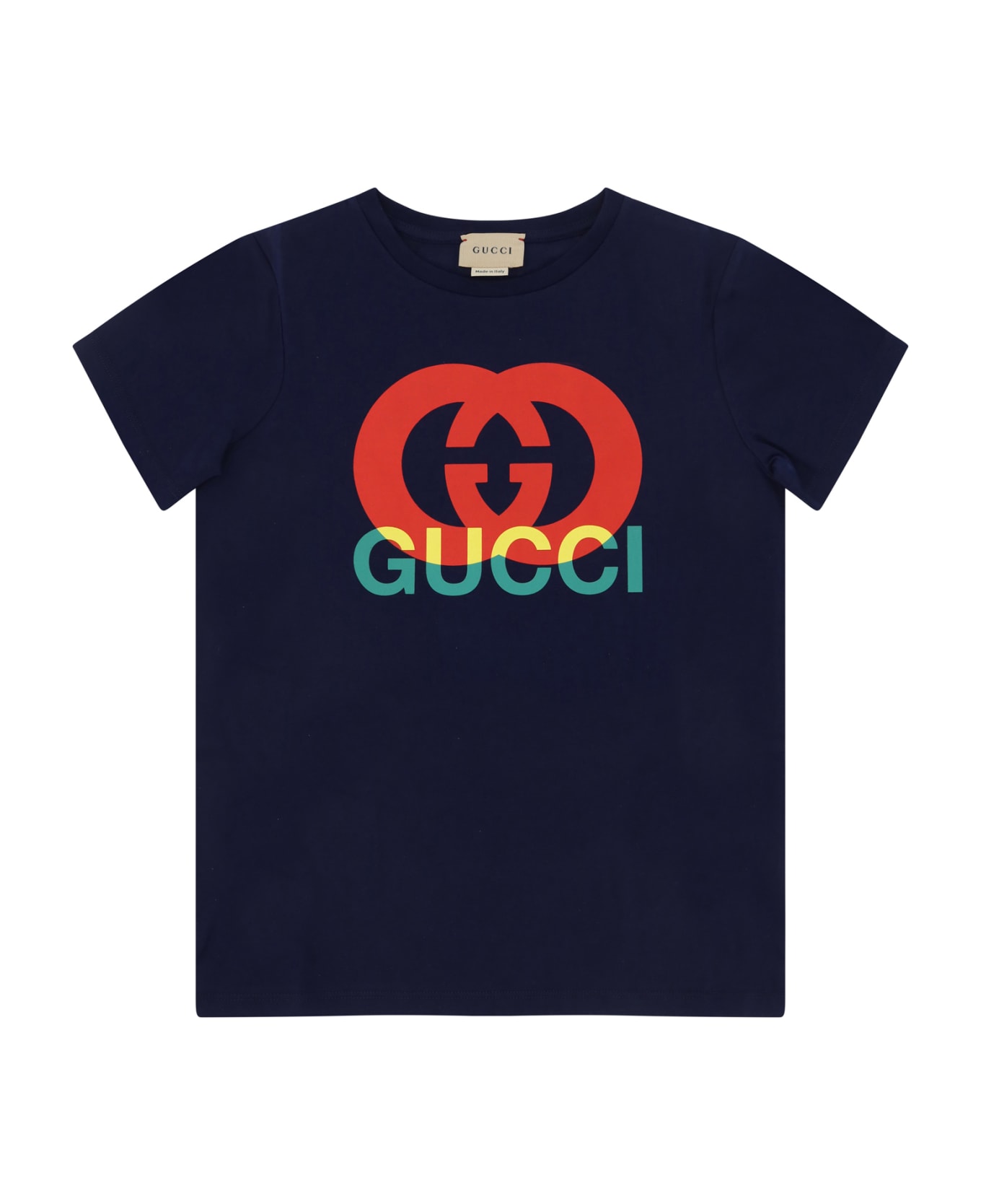 Cotton t-shirt for boy by gucci, ribbed crew neck, print on the front with iconic multicoloured brand signature. Composition: 100% % Cotton
