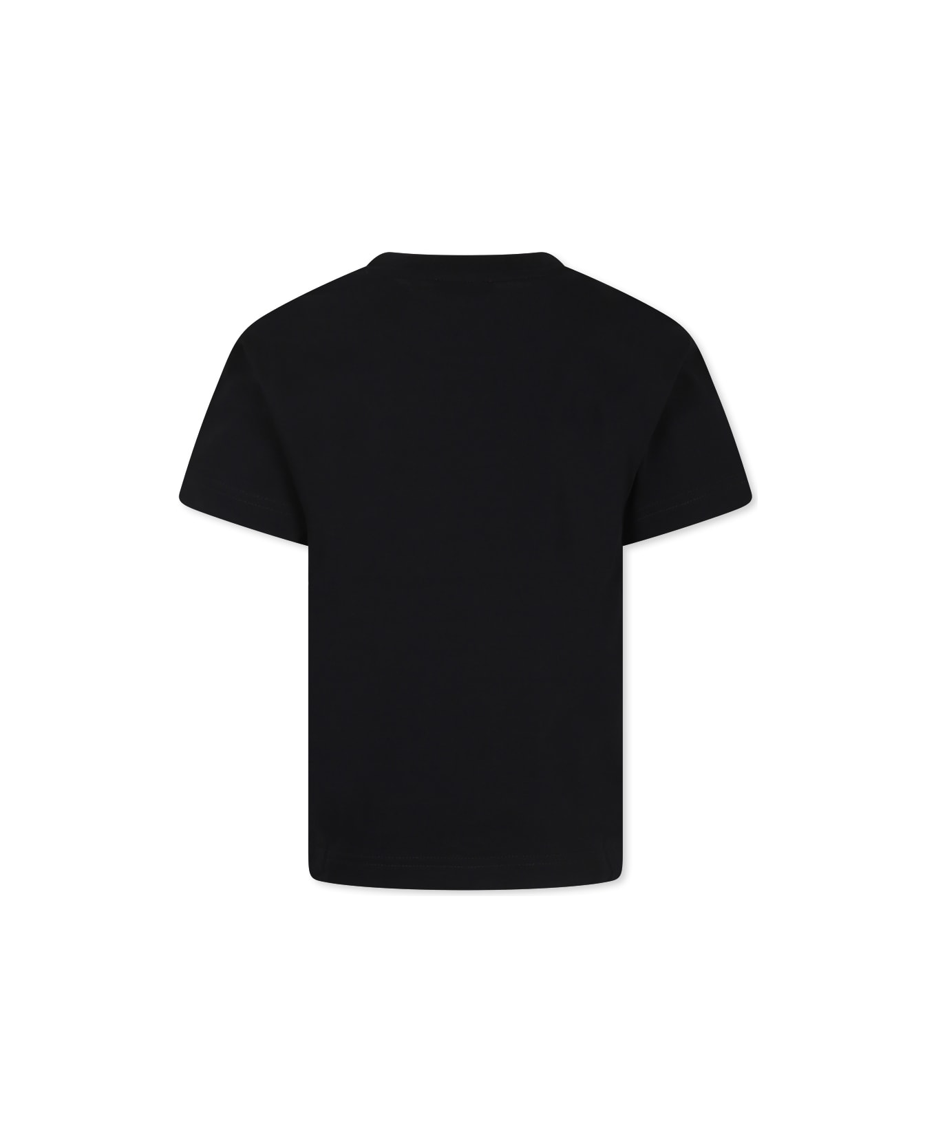 Black cotton t-shirt, with short sleeves and ribbed crew neck. It is embellished with silver logo on the front.
