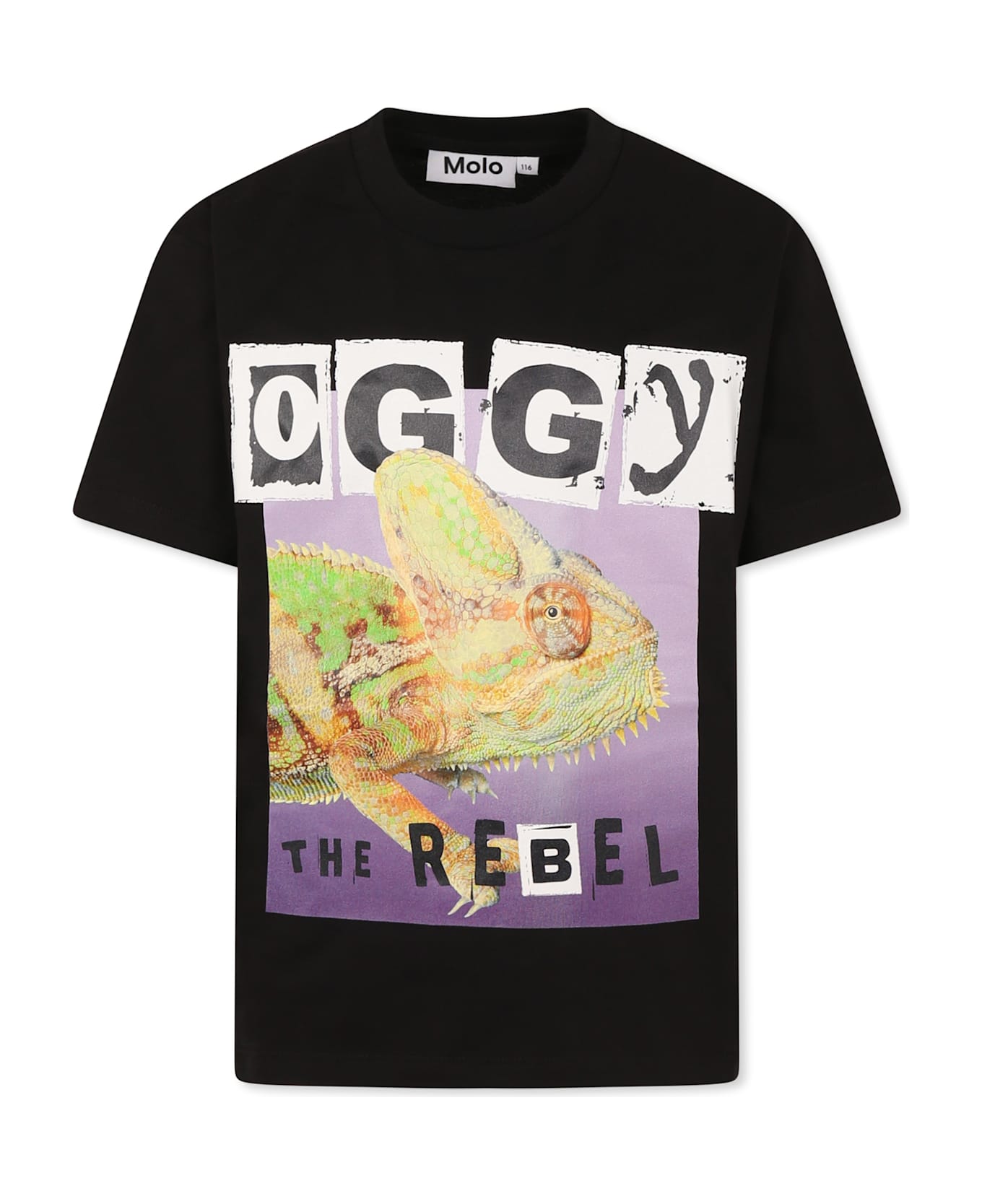 Black t-shirt in GOTS certified organic cotton, with short sleeves and a ribbed crew neck. It is embellished with chameleon print and writing on the front.