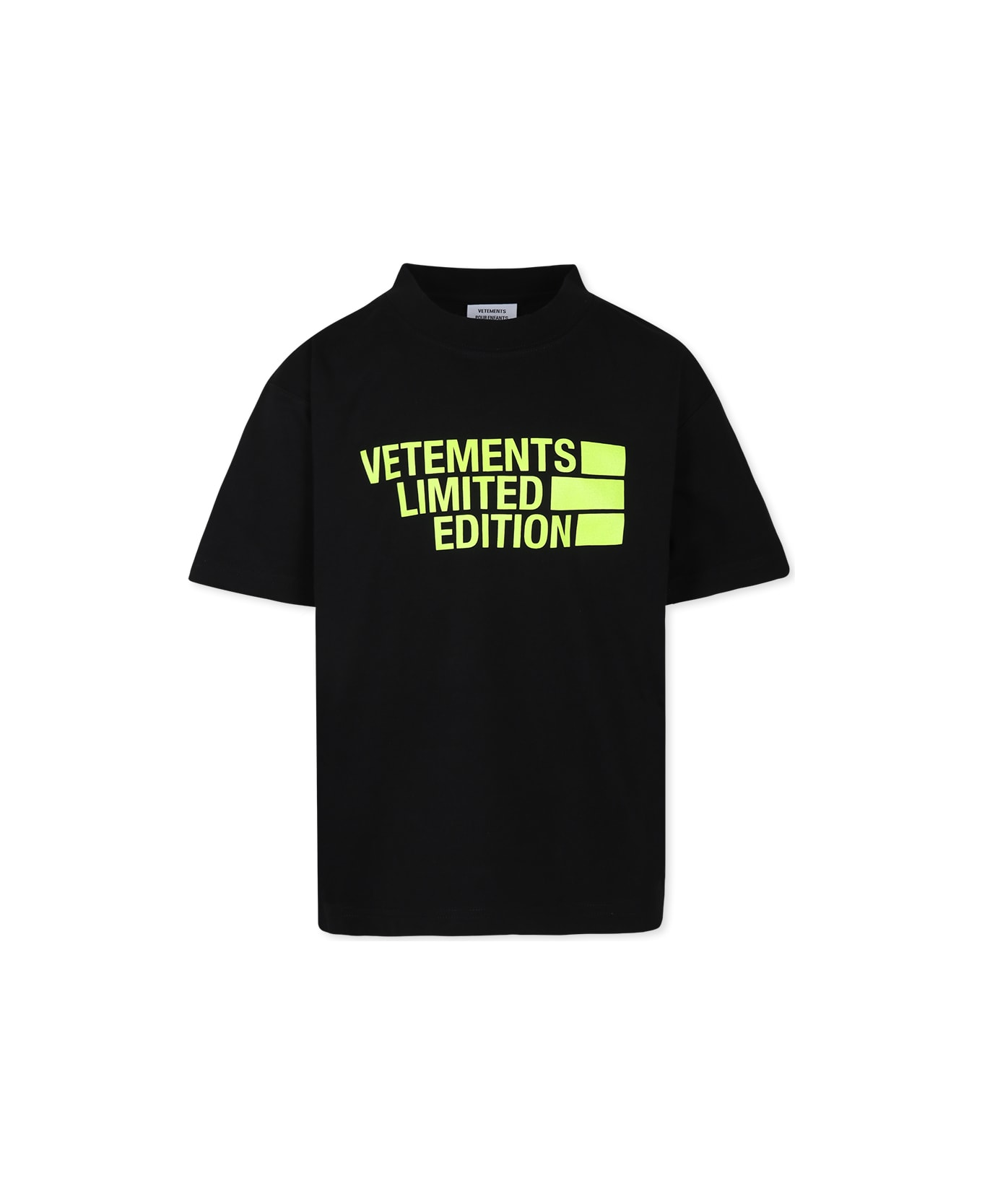 Black T-shirt made of soft cotton jersey with short sleeves, crew neck and ribbed hem. It is embellished with neon yellow logo on the front and black embroidered logo on the back.