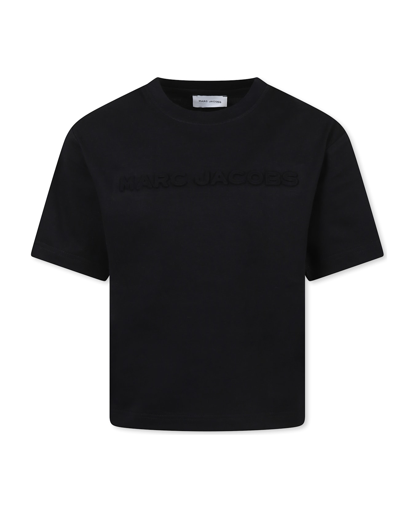 Black organic cotton t-shirt with short sleeves and ribbed crew neck. It is embellished with embossed logo on the front.