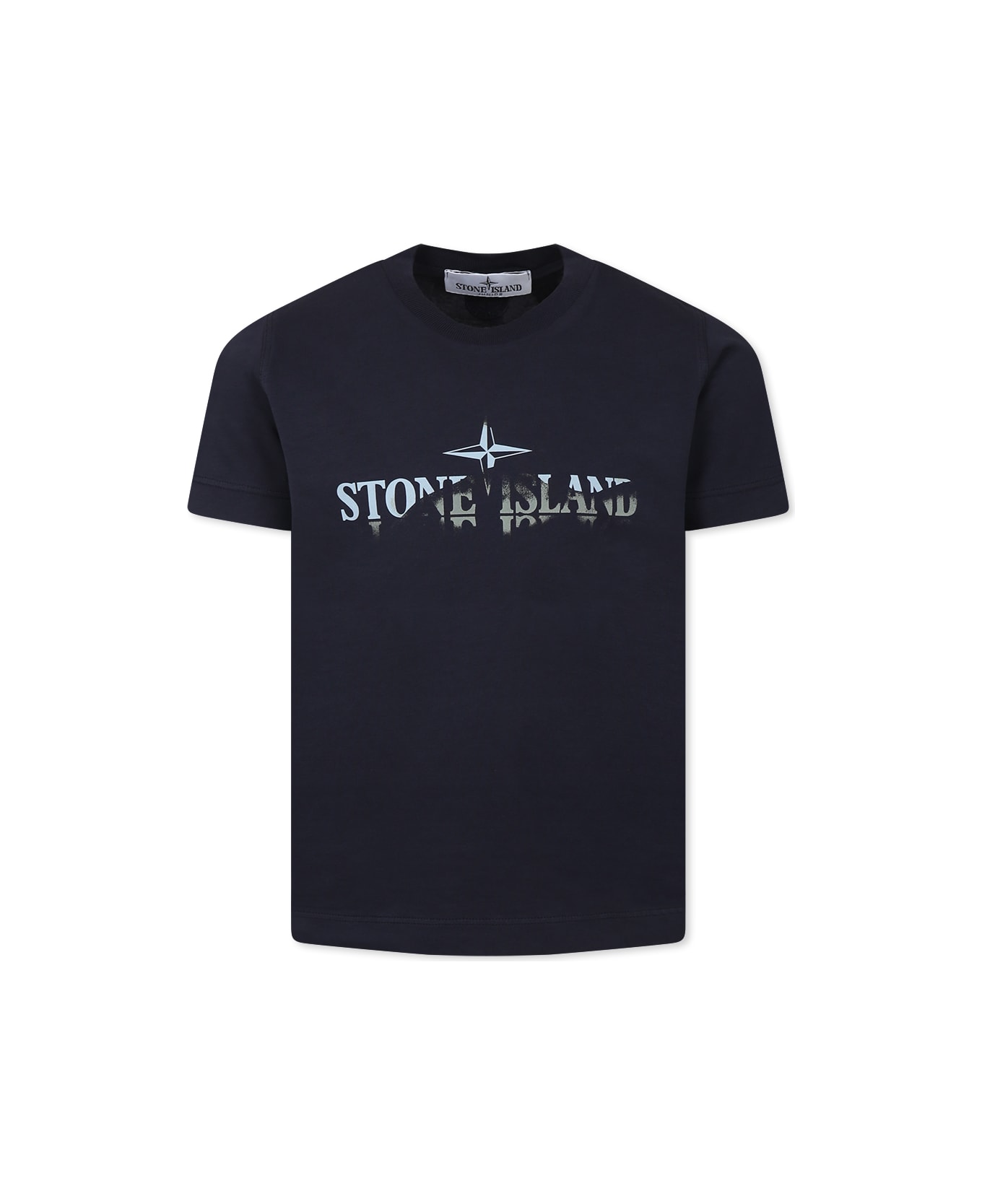 Blue cotton t-shirt, with short sleeves and ribbed crew neck. It is embellished with logo printed on the front and iconic compass on the front and back.