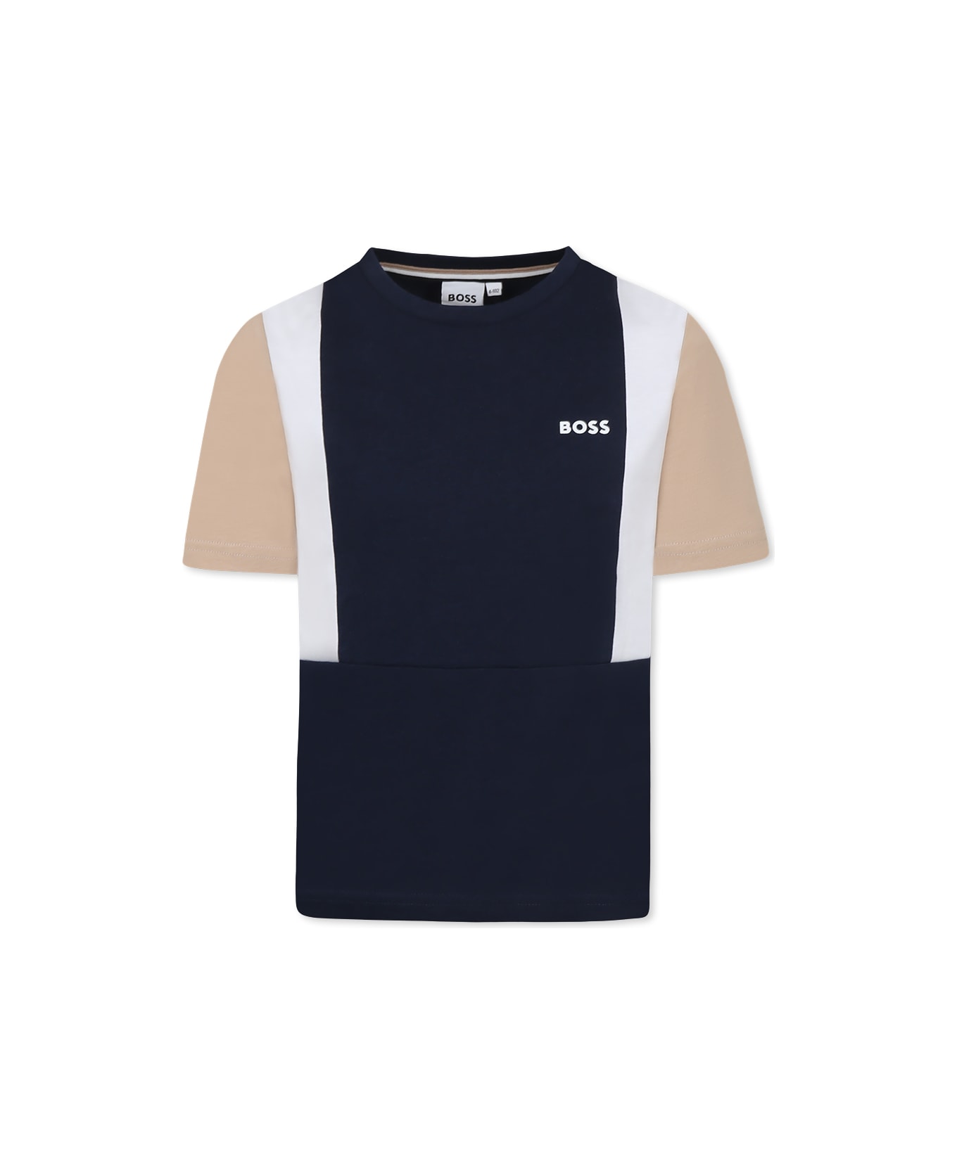 Blue cotton t-shirt, with short sleeves, ribbed crew neck and contrasting white and beige details on the sides. It is embellished with white logo on the chest.