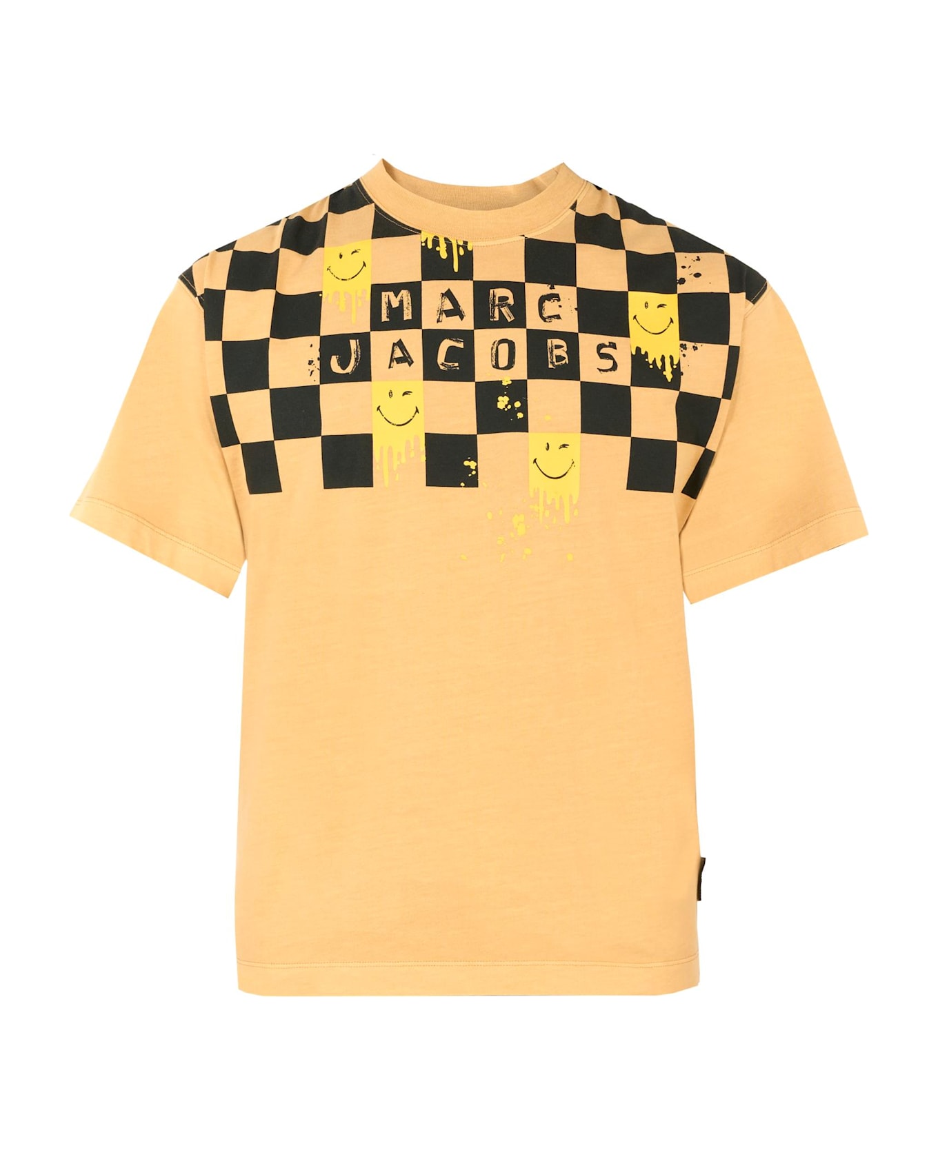 Brown organic cotton t-shirt, with short sleeves and a ribbed crew neck. It is embellished with a logo print, checkered pattern and smiley face, on the front. This garment may have irregularities in color due to the special treatment used to make it, which gives each piece a unique and exclusive look.