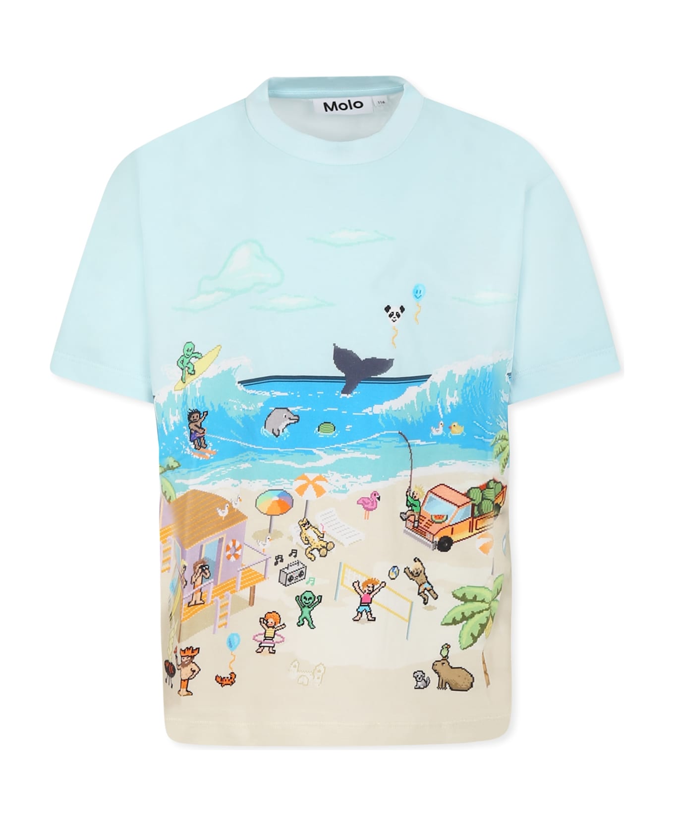 Light blue GOTS certified organic cotton t-shirt, with short sleeves and ribbed crew neck. It is embellished with pixel beach print on the front and back.