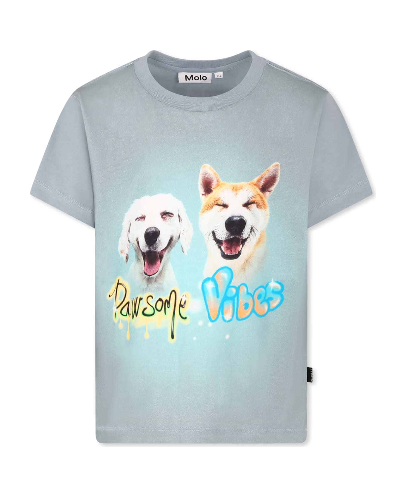 Light blue t-shirt in GOTS certified organic cotton, with short sleeves and a ribbed crew neck. It is embellished with dog print and writing on the front.