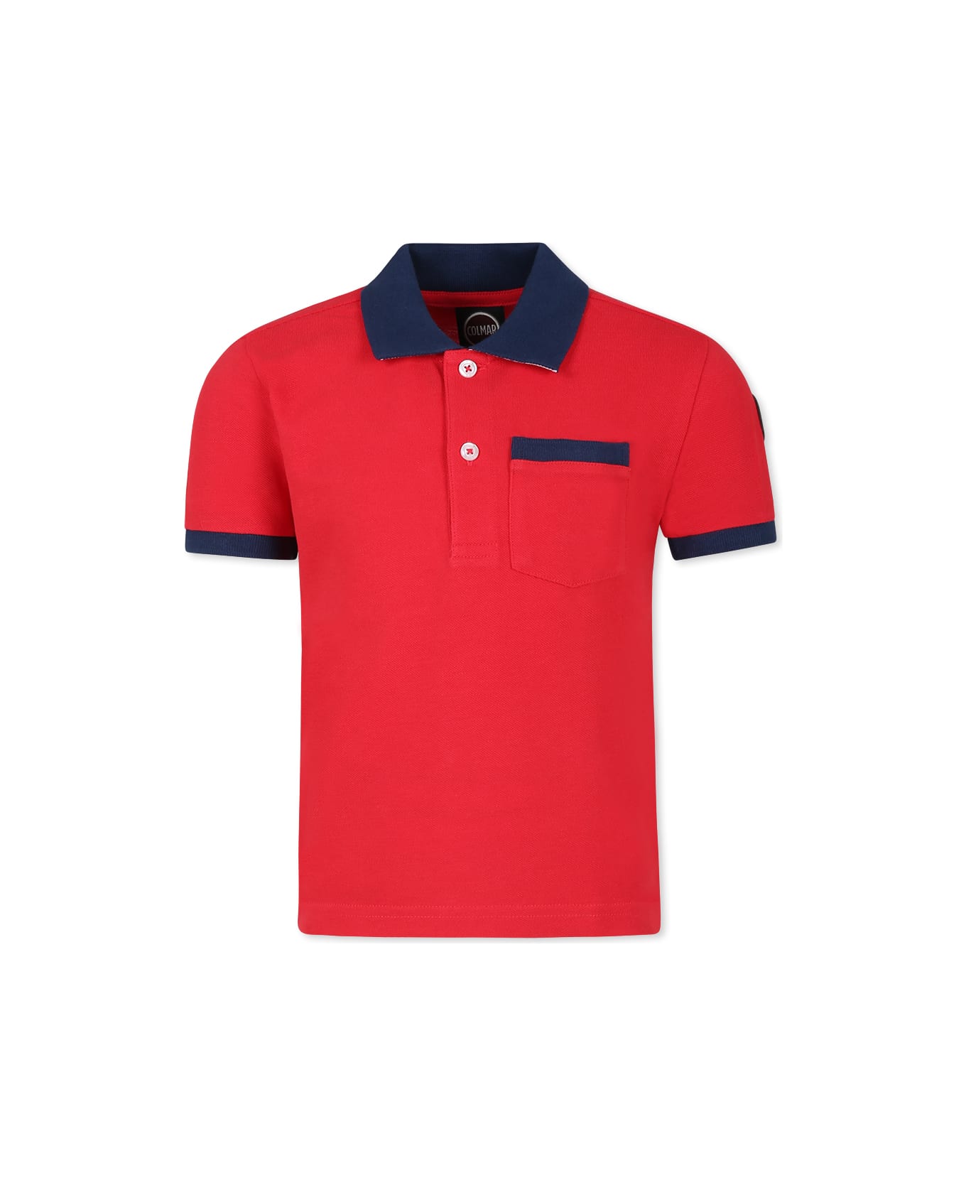 Red cotton piqué polo shirt, short sleeves, blue pointed collar, front button closure, blue piping and patch pocket on the chest. It is embellished with iconic rubberized logo on the sleeve.