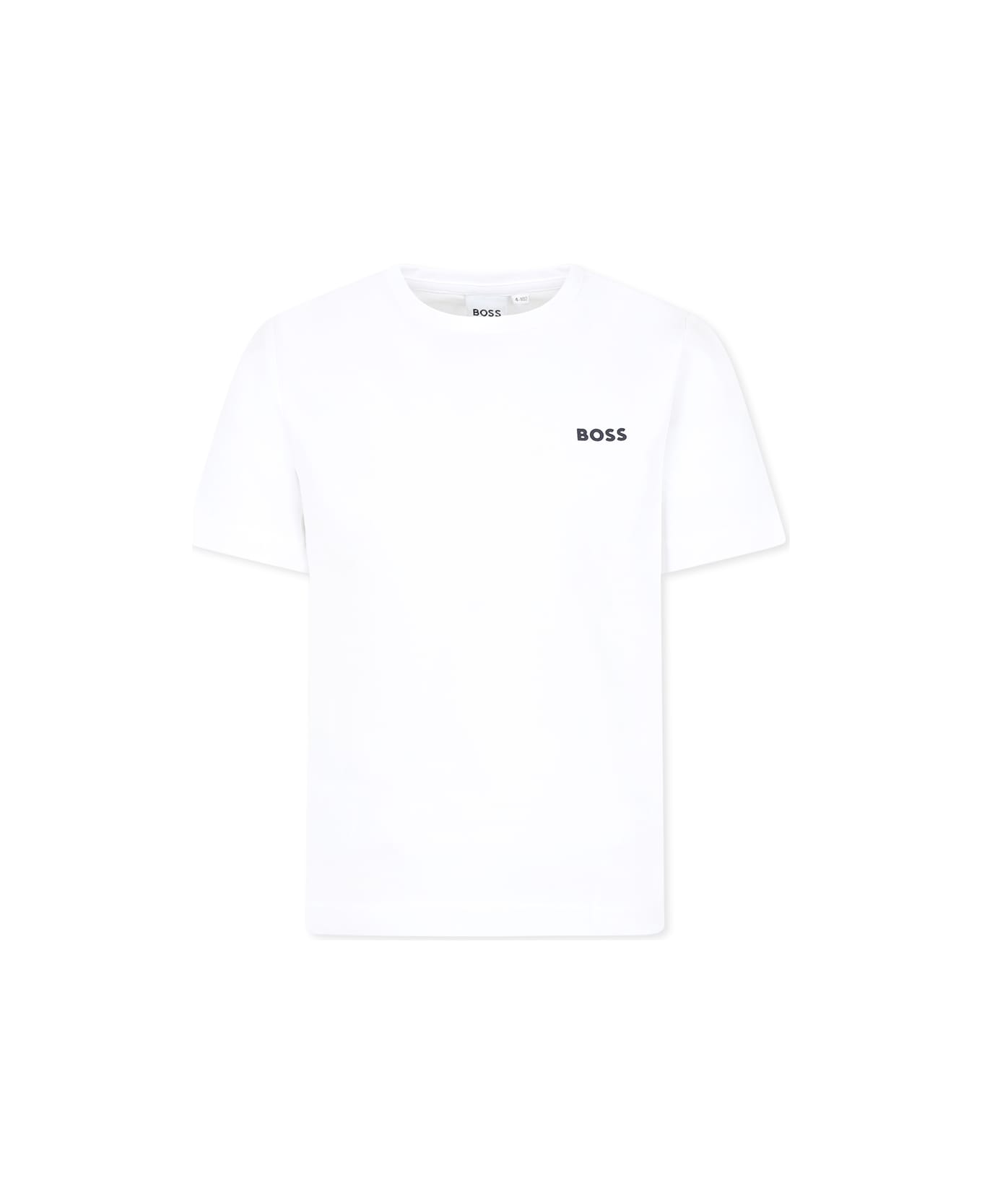 White cotton t-shirt, with short sleeves and ribbed crew neck. It is embellished with blue rubberized logo on the chest.
