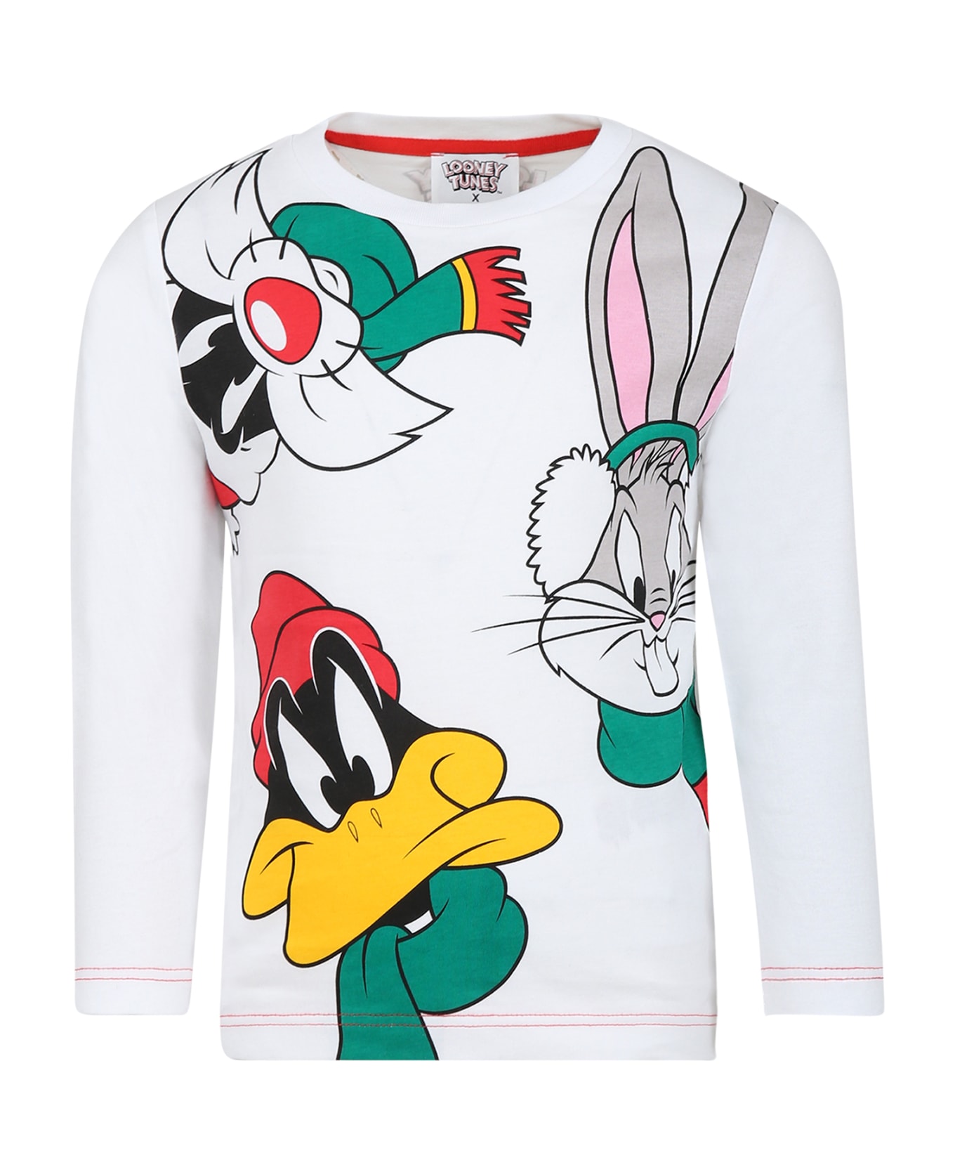 White organic cotton t-shirt, long sleeves, with ribbed crew neck. It is embellished with Looney Tunes print with Sylvester, Bugs Bunny and Daffy Duck on the front. It is a Looney Tunes collaboration for Marc Jacobs.