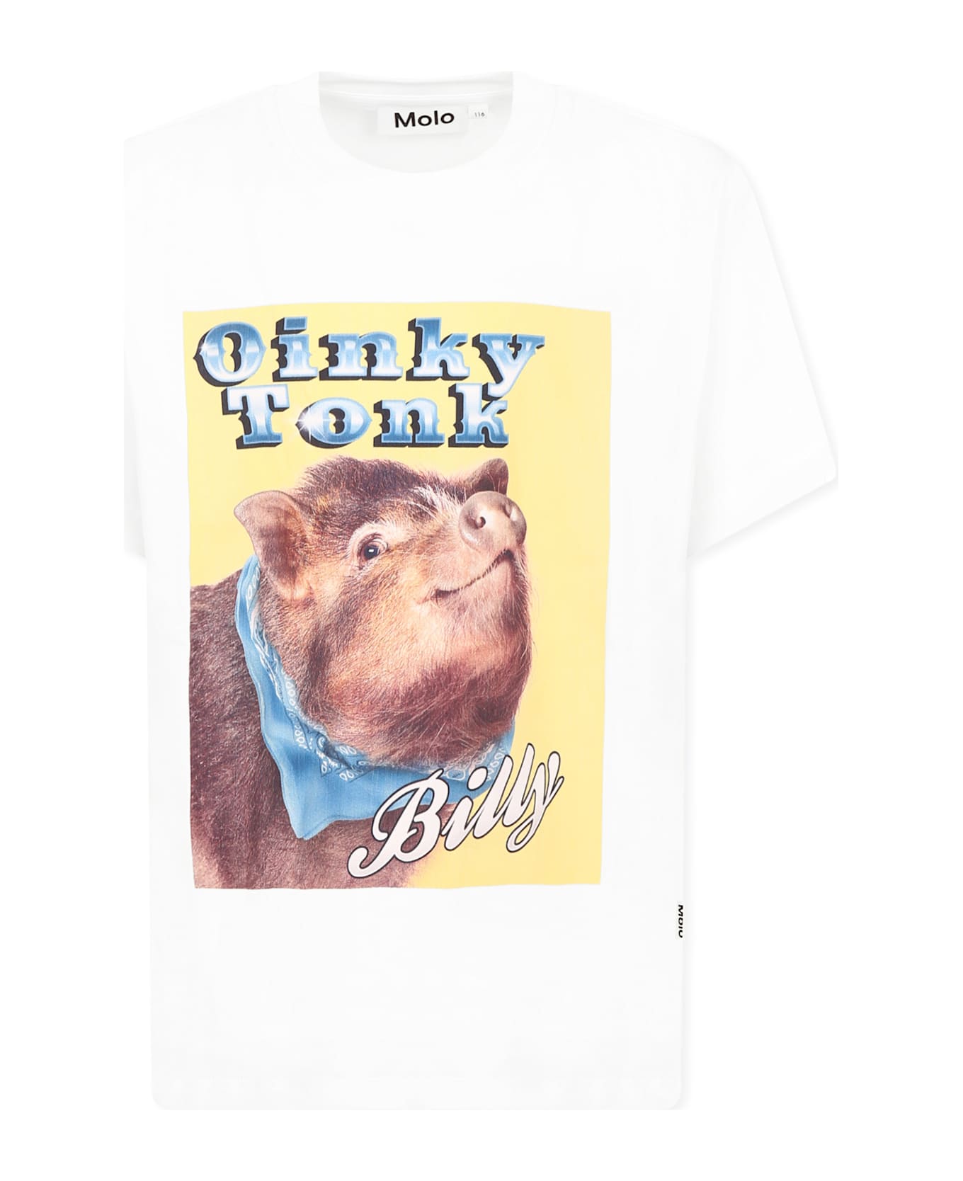 White t-shirt in GOTS certified organic cotton, with short sleeves and a ribbed crew neck. It is embellished with a boar print and writing on the front.