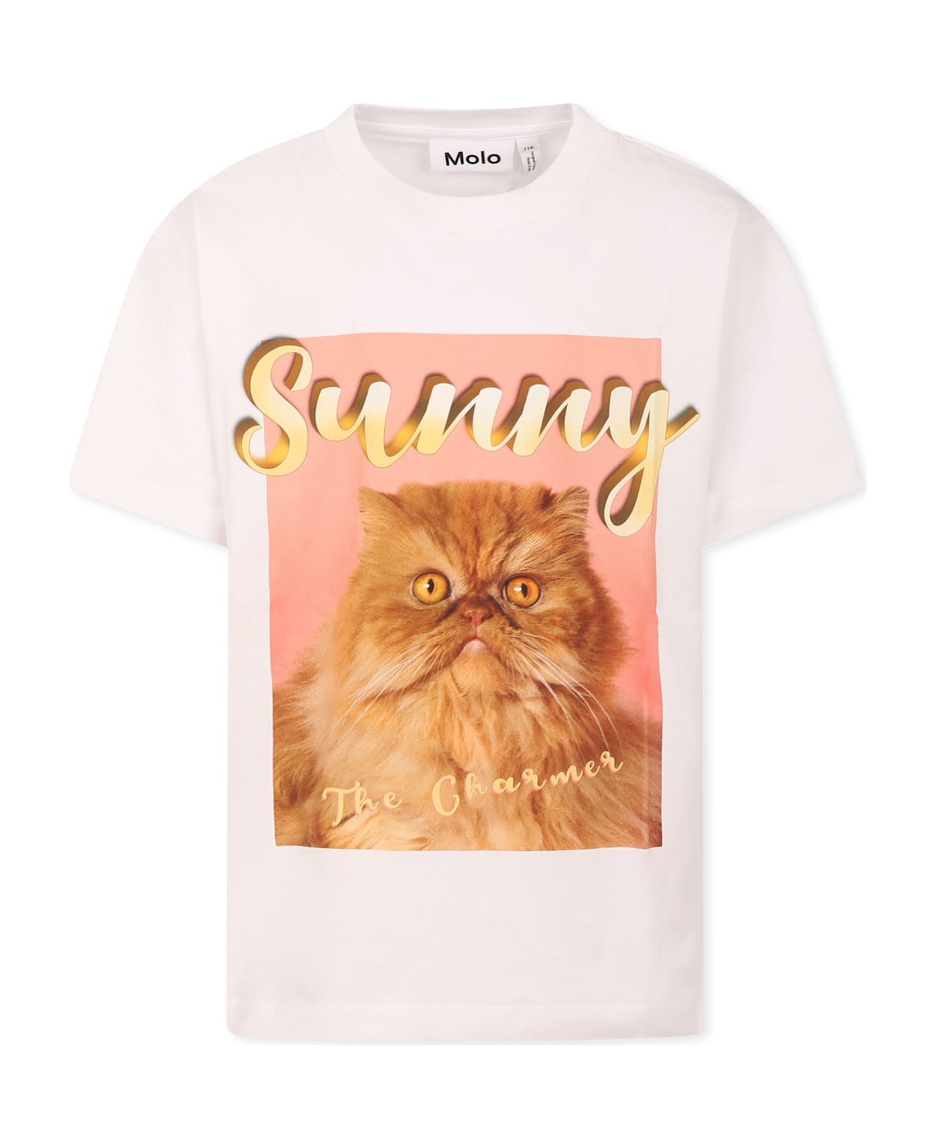 White t-shirt in GOTS certified organic cotton, with short sleeves and a ribbed crew neck. It is embellished with cat print and "Sunny" writing on the front.