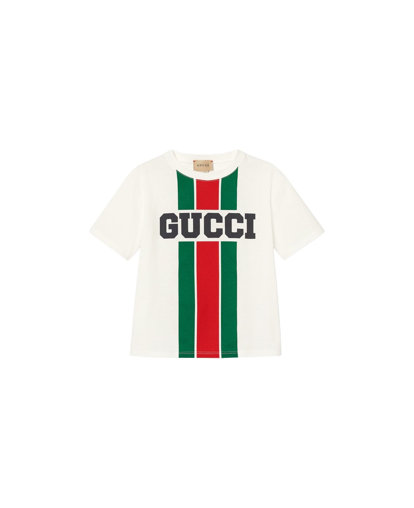 Gucci Kids oversized T-shirt made from white cotton jersey and embellished with a Gucci Web print. Model with crew neck, short sleeves, ribbed trim. Oversize cut. Composition: Composition:, 100% Cotton.