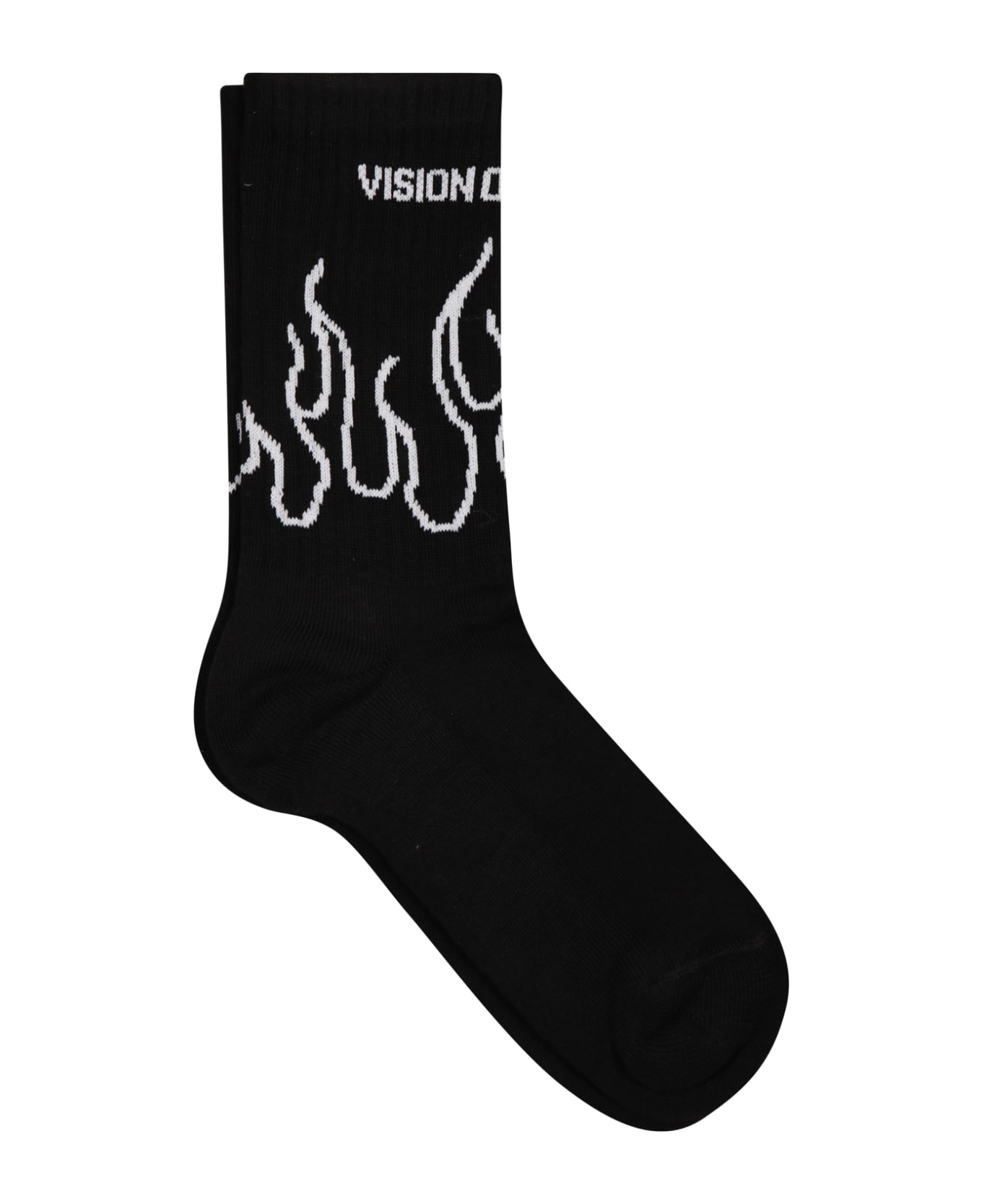 Black terry socks. They are embellished with white flames and white logo of the brand.