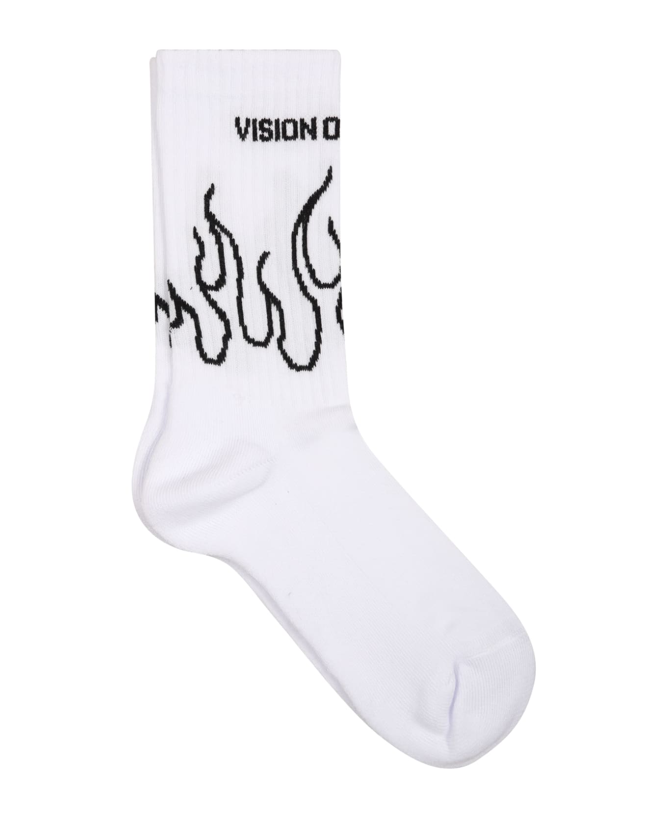 White terry socks. They are embellished with black flames and back logo of the brand.